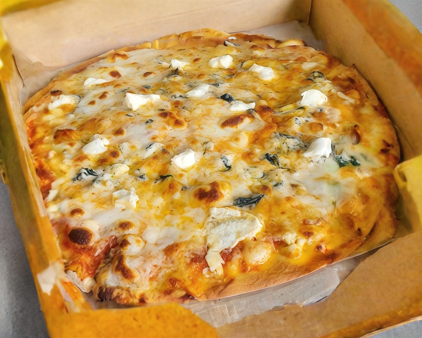 Pizza a la leña con nuestra mezcla de quesos ,queso crema y de cabra. 35cm