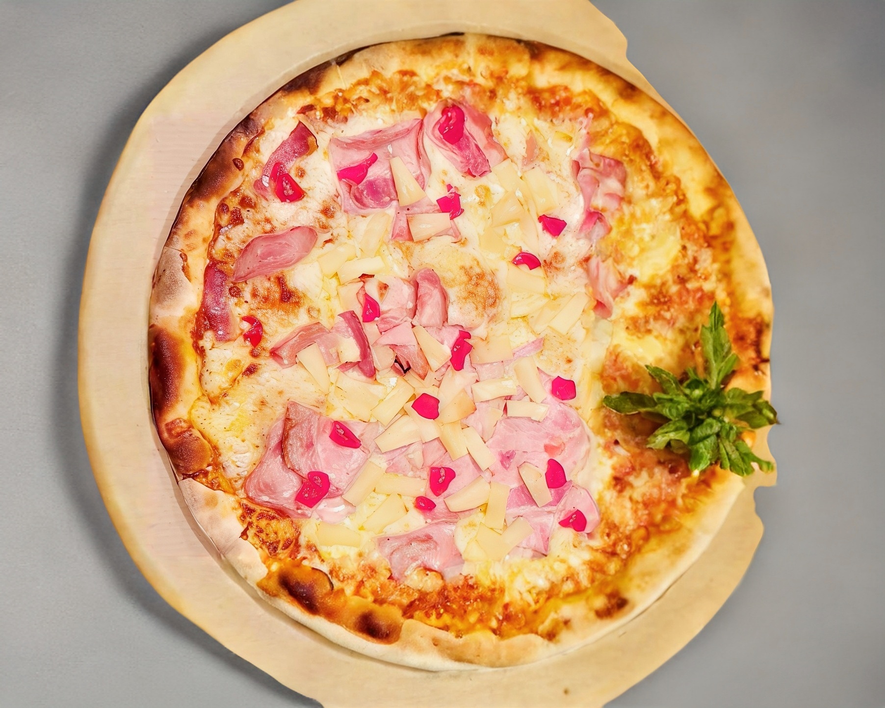 Pizza a la leña con Jamón, piña, cereza, tocino y nuestra mezcla de quesos. 35 cm