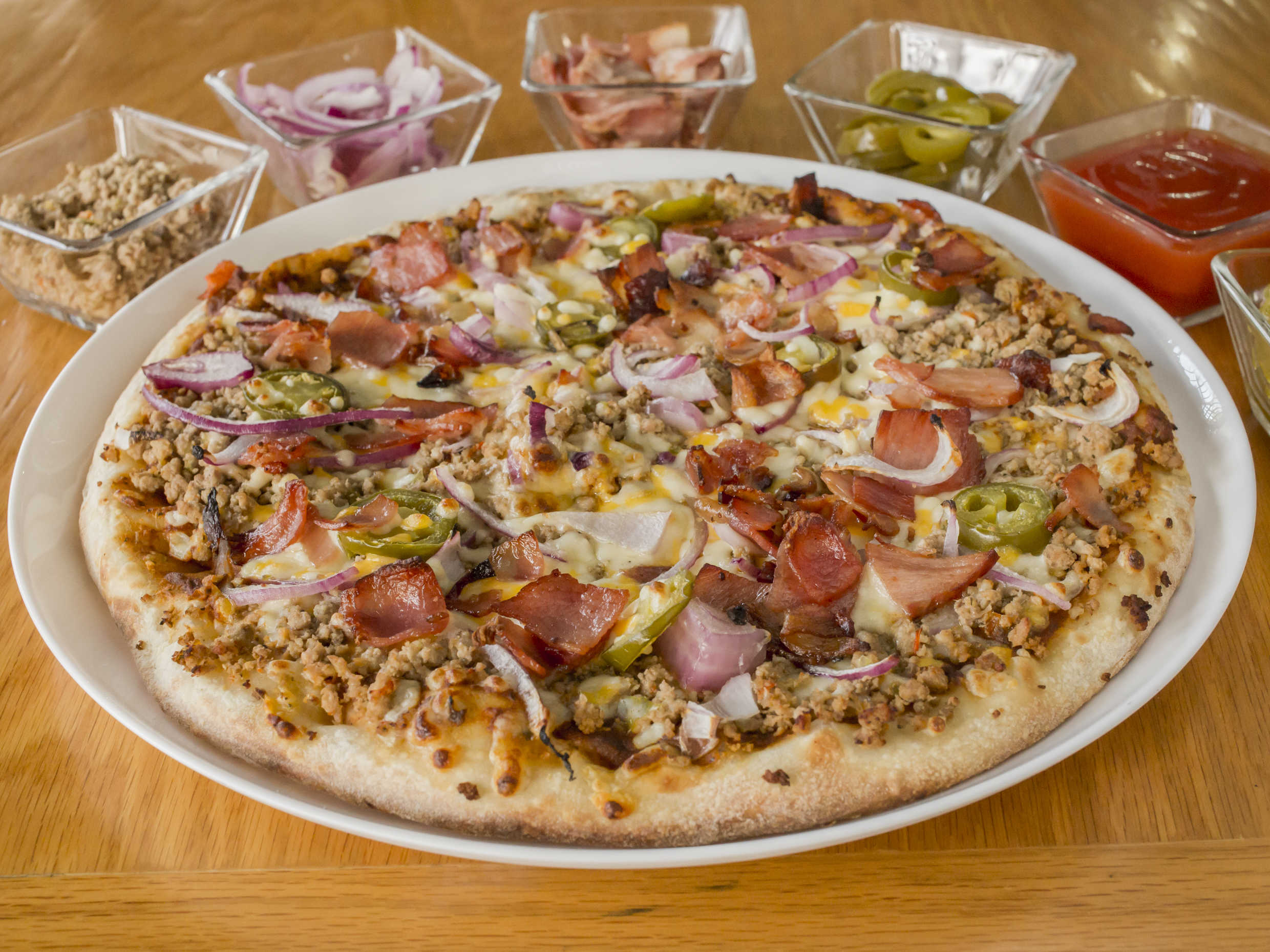 Carne molida, tocino, cebolla y jalapeño.