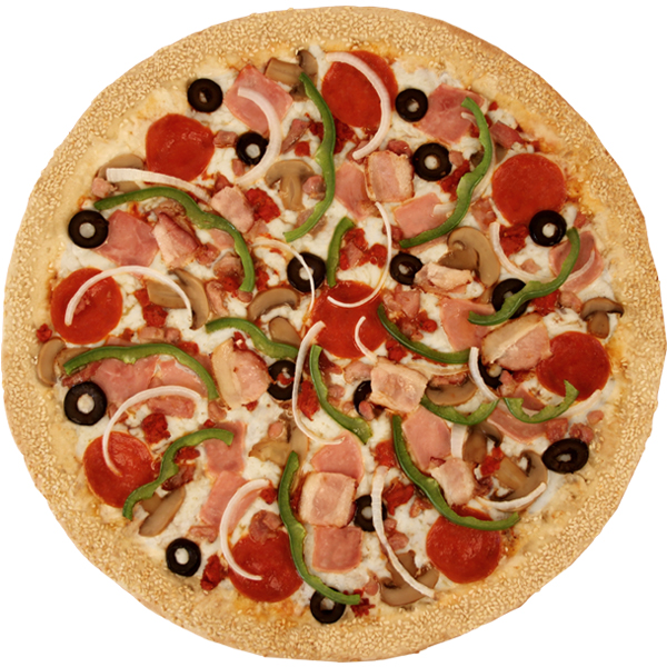 Salami, pepperoni, aceituna negra, pimiento y champiñones.