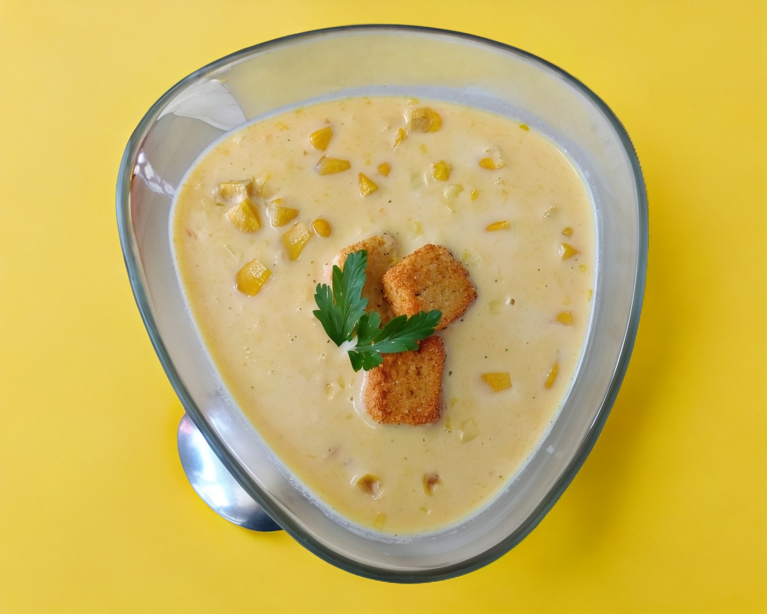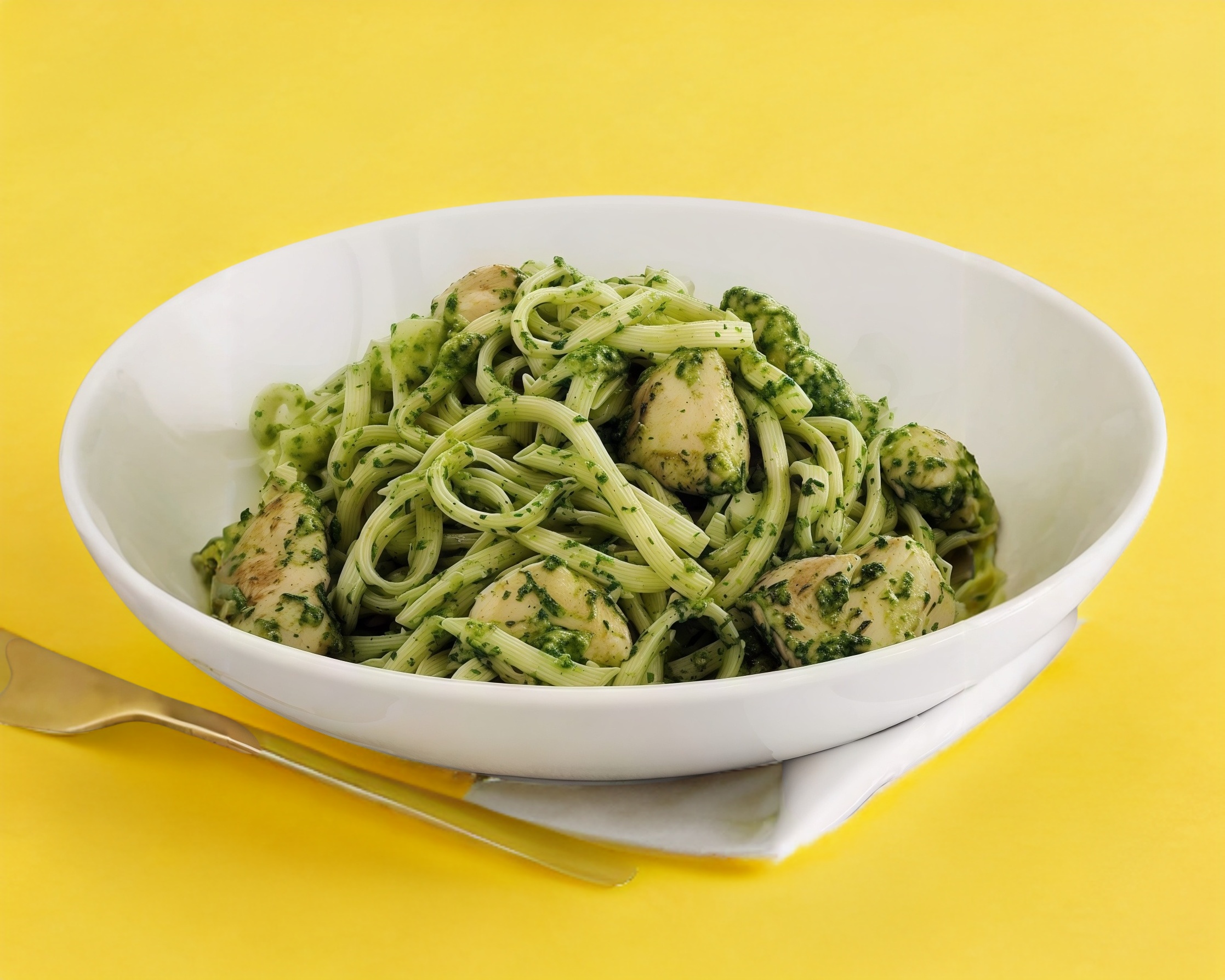 Bañada en deliciosa crema a base de chile poblano y queso parmesano, (180g) de pasta, (55g) de proteina a elegir: Carne, molida, camaron, tocino, pollo
