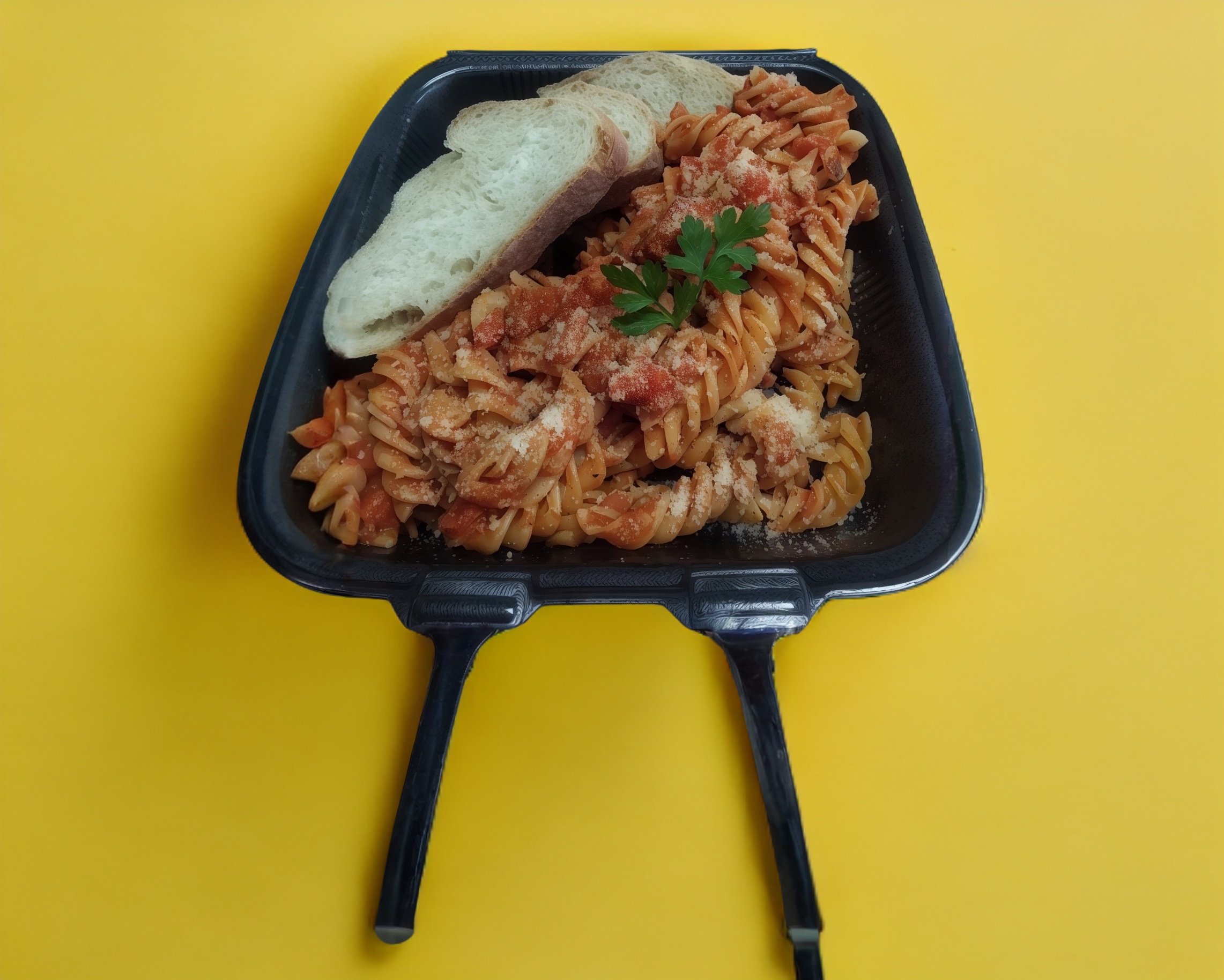 Bañada en salsa de tomate, albahaca, queso parmesano, zanahoria, jitomate y cebolla finamente picados, 180 grs de pasta, 55 grs de proteina a elegir