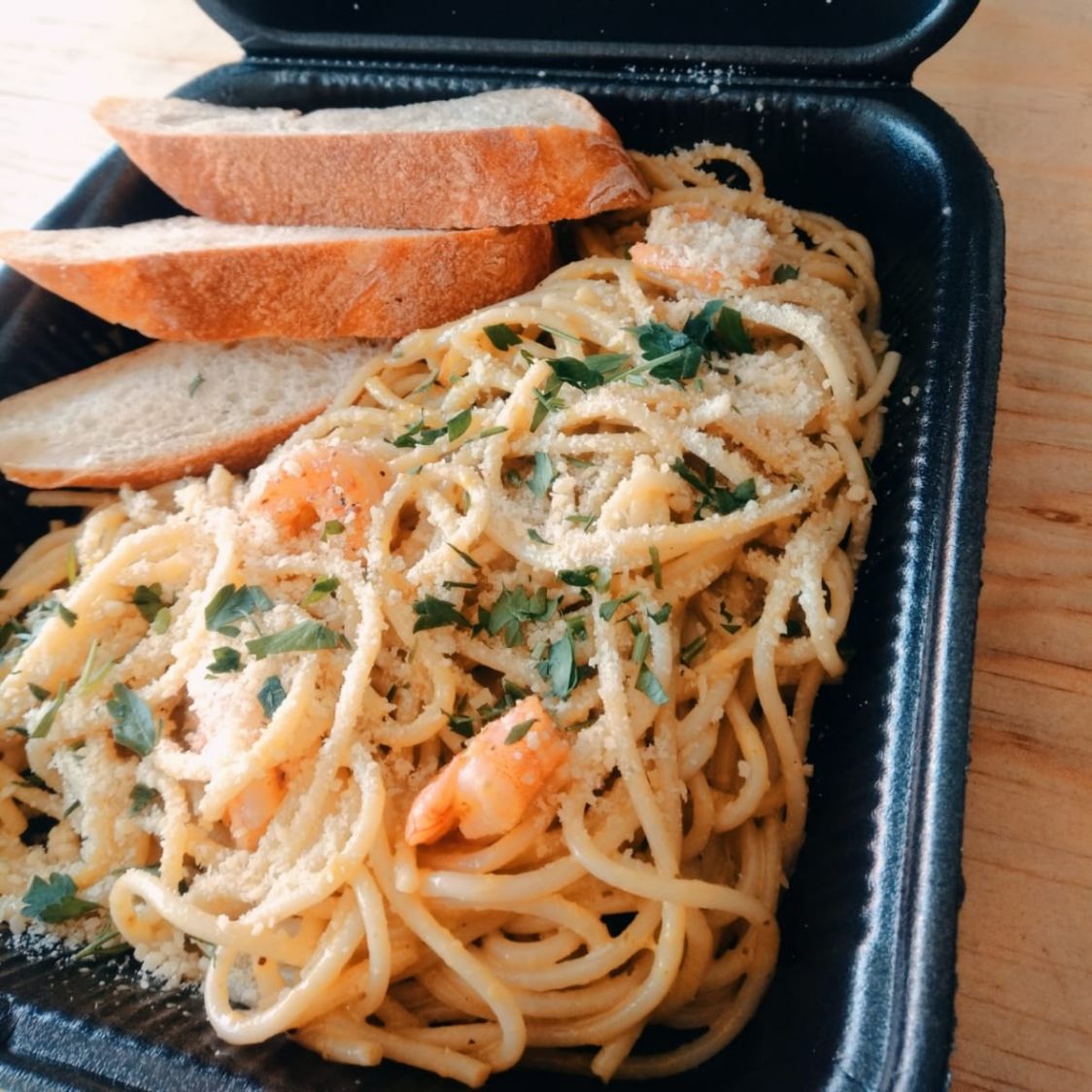 Bañada en salsa carbonara a base de queso parmesano, ajo finamente picado, tocino, 180 grs de pasta, 55 grs proteina a elegir