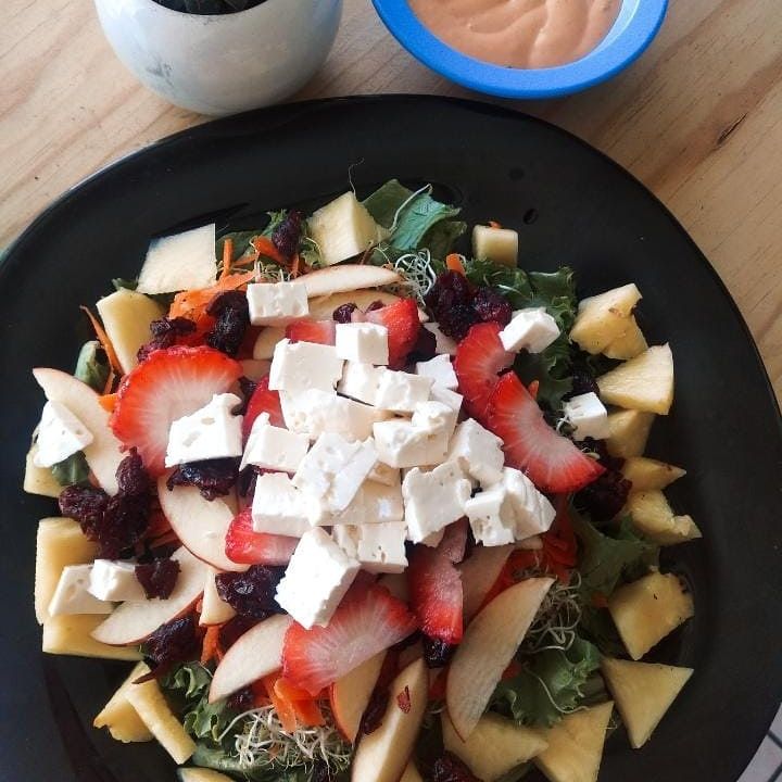 A base de lechuga, zanahoria rallada, piña, manzana, fresa, arandanos, germinado de alfalfa y pasta.
