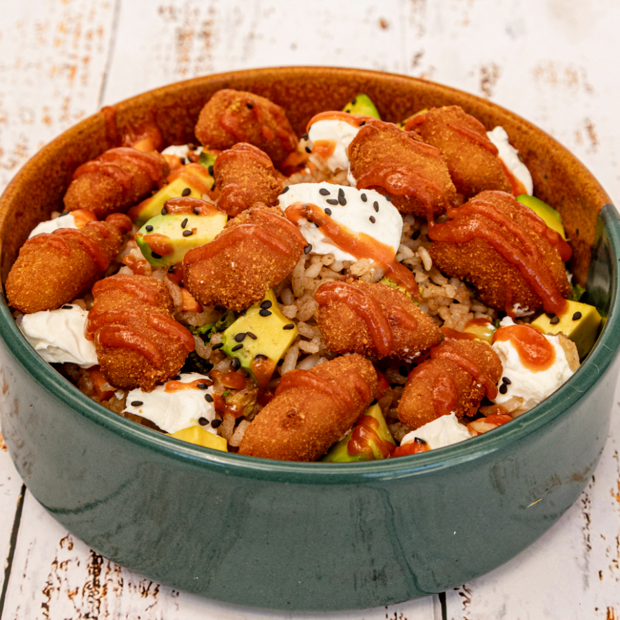 Arroz frito con verduras,philadelphia y aguacate,acompañado de palomitas de Camarón Empanizados ,un toque de anguila y sirasha