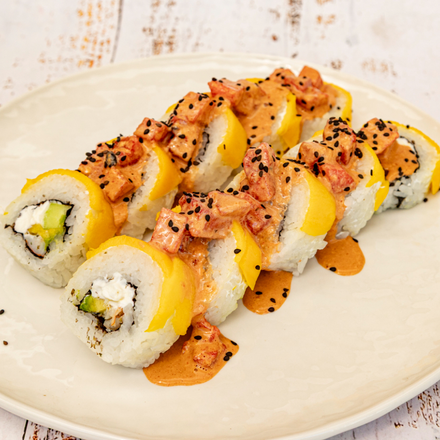 Camarón,aguacate,philadelphia y pepino por dentro,envuelto en mango y topping de sandía spicy