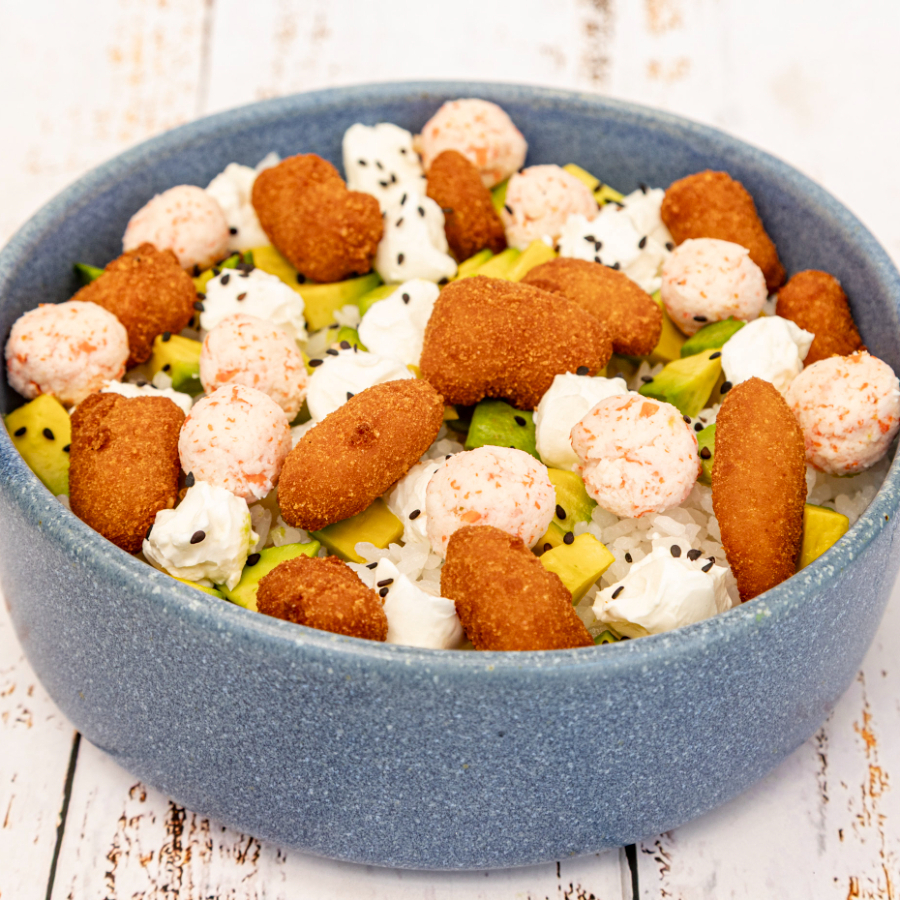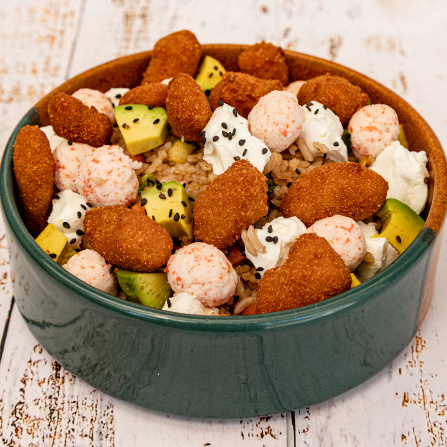 Arroz frito con verduras,philadelphia,aguacate,palomitas de camarón y tampico (ensalada de surimi)