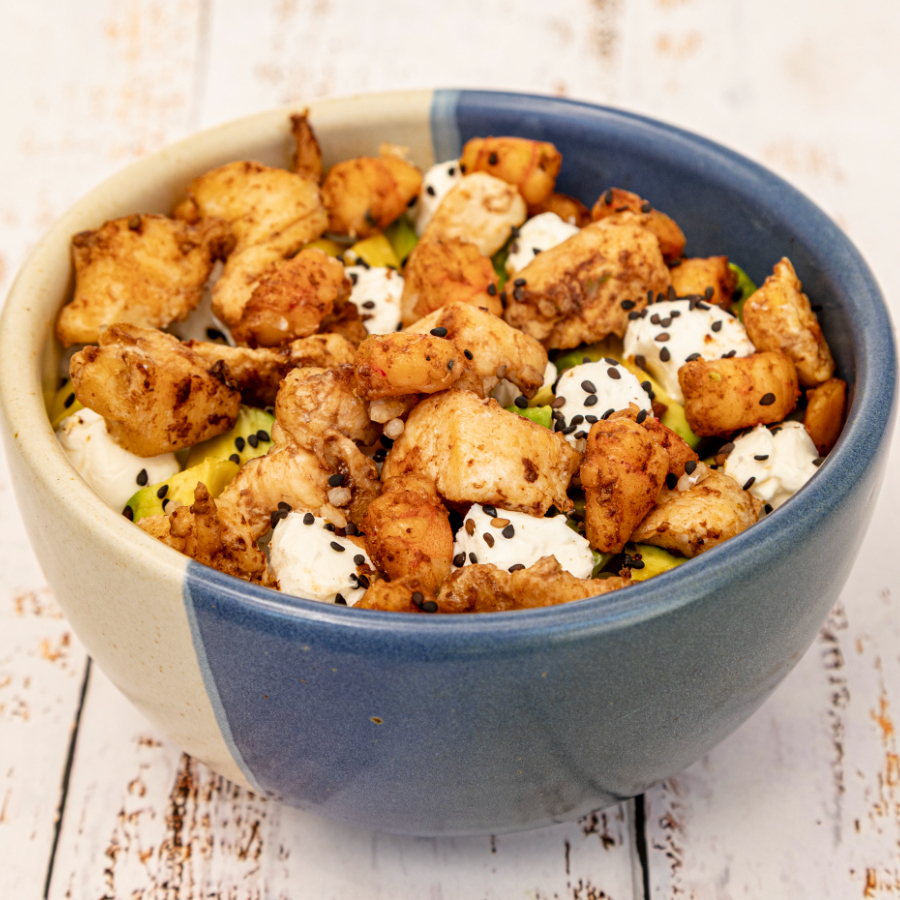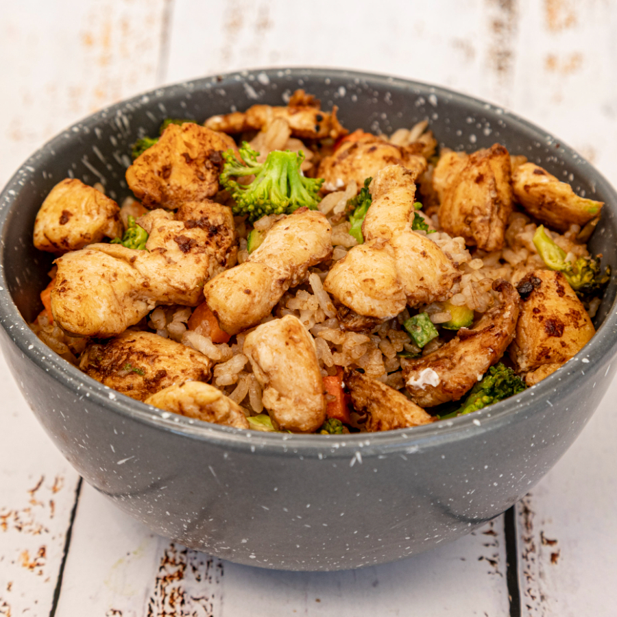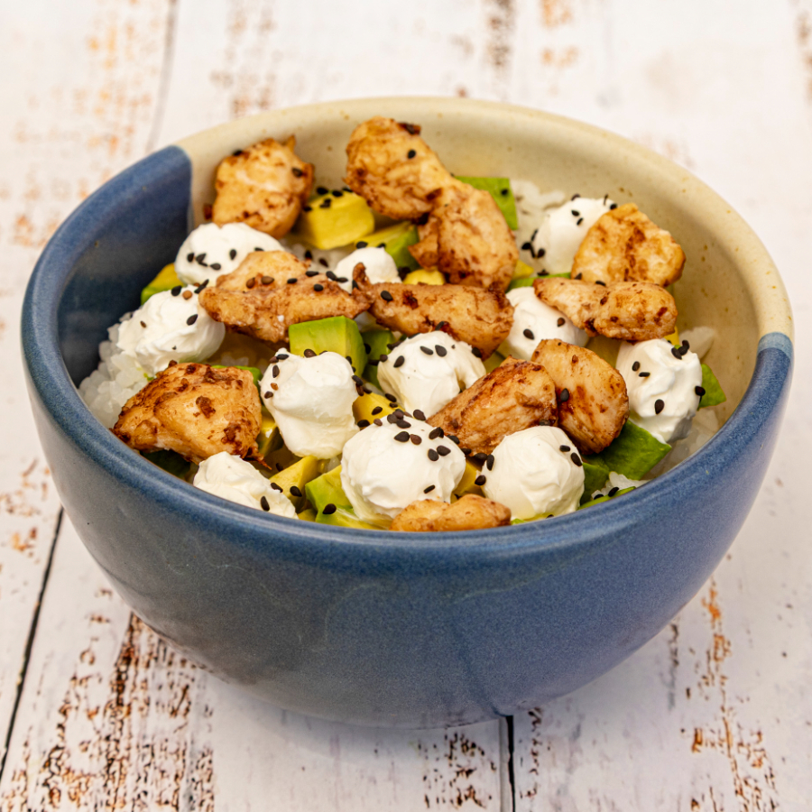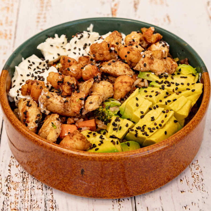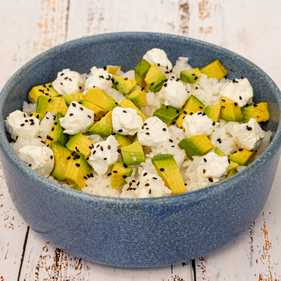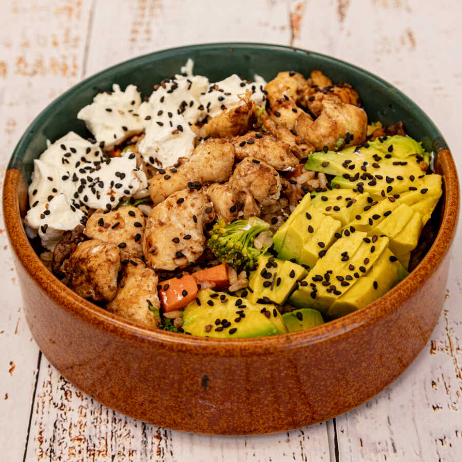 Yakimeshi de pollo (50 Gramos)arroz frito con zanahoria, brocolí, calabaza, pimiento verda, acompañado de cubitos de aguacate y queso Philadelphia.