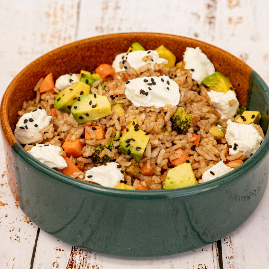 Yakimeshi vegetariano (50 Gramos) arroz frito, con zanahorita, brocolí, calabaza, pimiento verde, acompañado de cubitos de aguacate y queso Philadelphia.