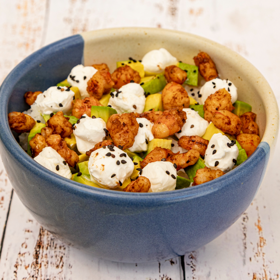 Avocado de pepino y Philadelphia por dentro, envuelto en aguacate, coronado con palomitas de camarón empanizados y para finalizar un toque picante de salsa sirasha.