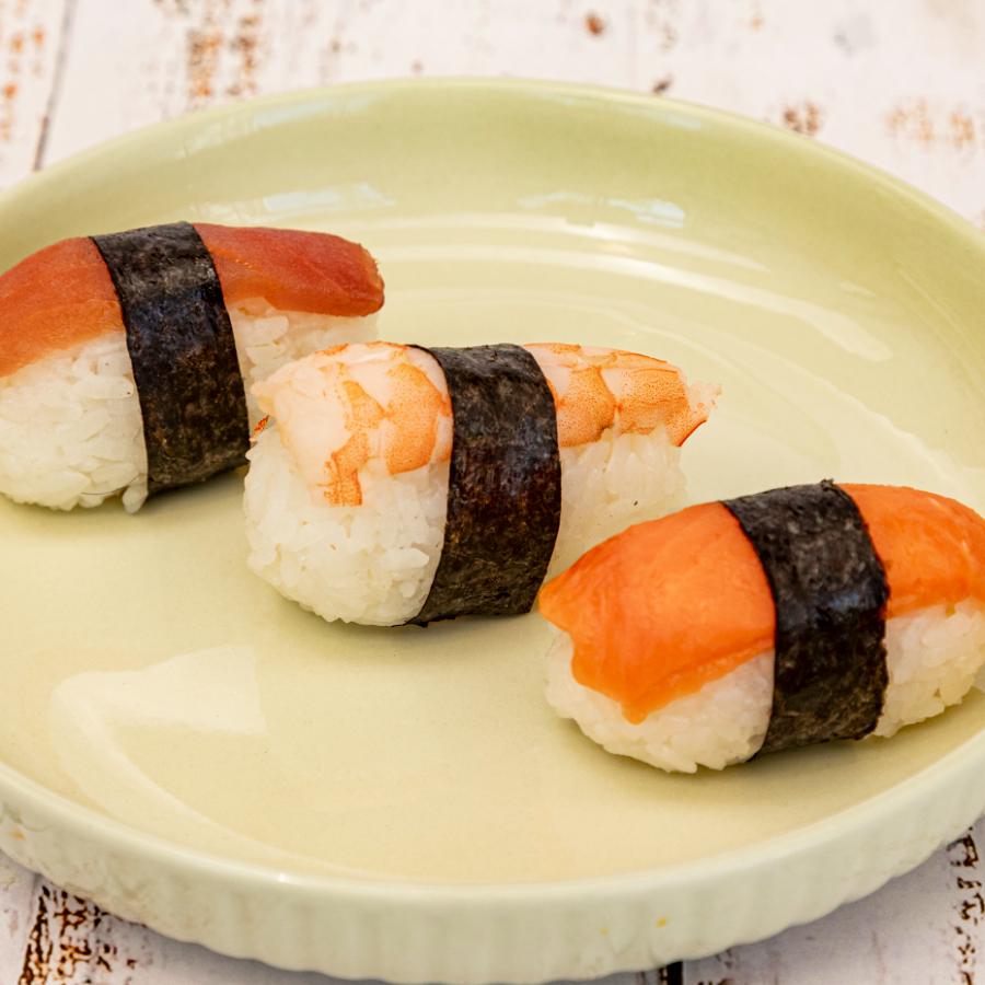 3 pequeños bocadillos de arroz con salmón fresco,atún y camarón