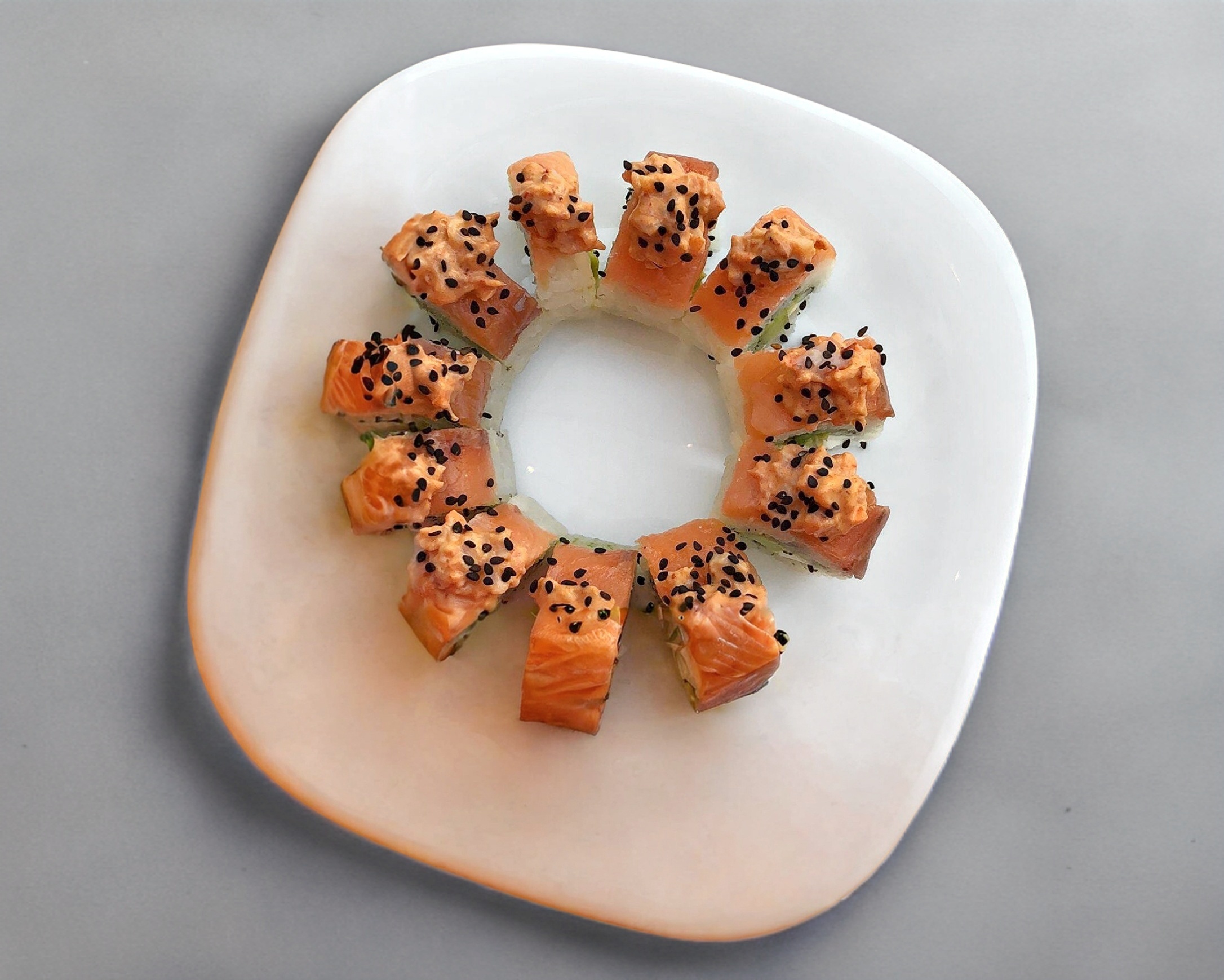 Por fuera salmón fresco, topping de jengibre y camarón,relleno de pepino, aguacate y philadelphia .