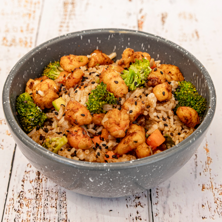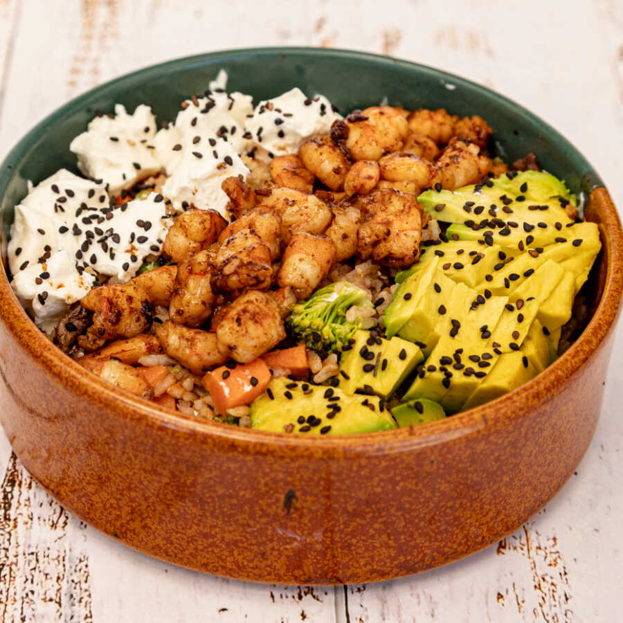 Yakimeshi de camarón (50 Gramos) arroz frito, con zanahorita, brocolí, calabaza, pimiento verde, acompañado de cubitos de aguacate y queso Philadelphia.