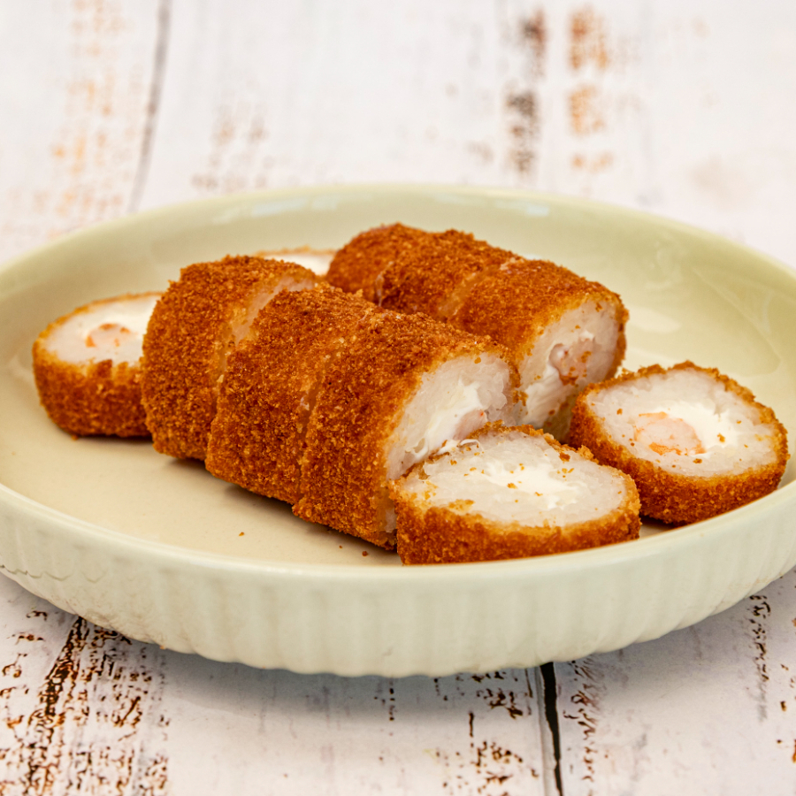 Empanizado bañado en salsa de queso ligeramente picante,con tocino crujiente,relleno de philadelphia,camarón,aguacate y pepino.