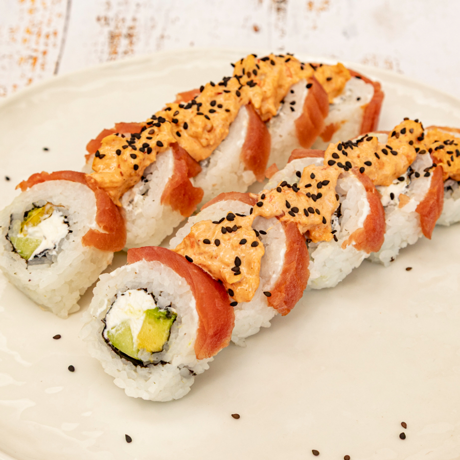 Rollo de aguacate, camarón y queso Philadelphia por dentro, envuelto en pepino, coronado con un topping de atún spicy y un exótico toque de limón.
