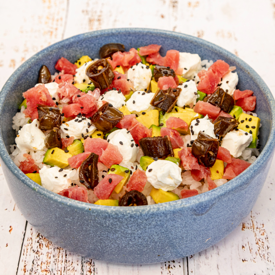 Arroz blanco acompañado de pepino,aguacate,queso philadelphia,cubitos de atún fresco, rodajas de chile serrano y ajonjolí negro.