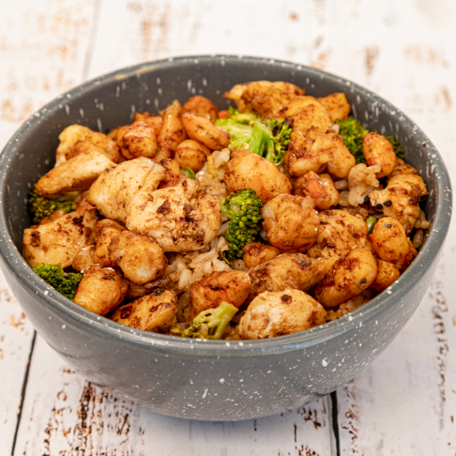Yakimeshi mar y tierra,Pollo y Camarón(50 Gramos) arroz frito, con zanahorita, brocolí, calabaza, pimiento verde,acompañado de cubitos de aguacate y queso Philadelphia.