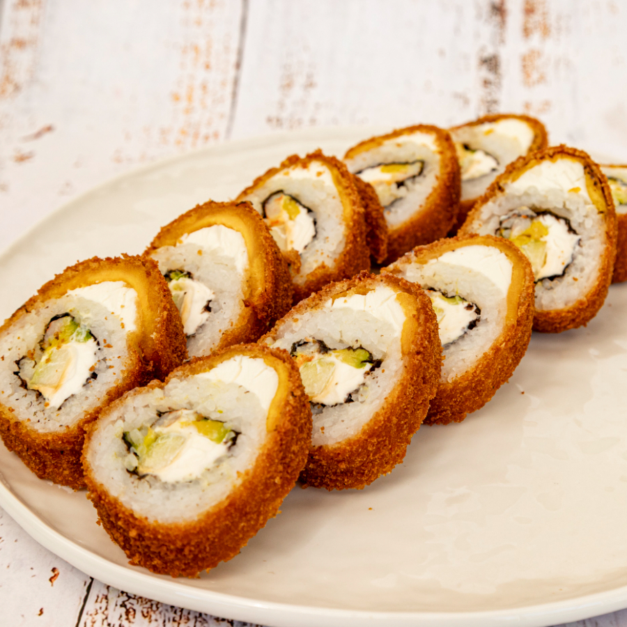 Rollo de Queso Philadelphia,aguacate,pepino y Camarón por dentro,envuelto en Platano Frito y doble Empanizado(Para mejor experiencia pruebalo con anguila