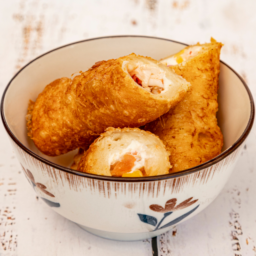 Clásico rollo empanizado, coronado con tampico cremoso topping de surimi.
