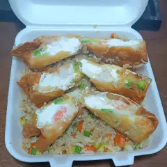 Rollitos de pasta ege rellenos de camarón, Philadelphia, aguacate, acompañado de arroz frito.