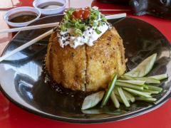 Bola de arroz empanizada rellena de philadelphia, aguacate, camarón co topping de ensalada de kani, aderezo de spicy, salsa de anguila, ajonjolí y cebollín.