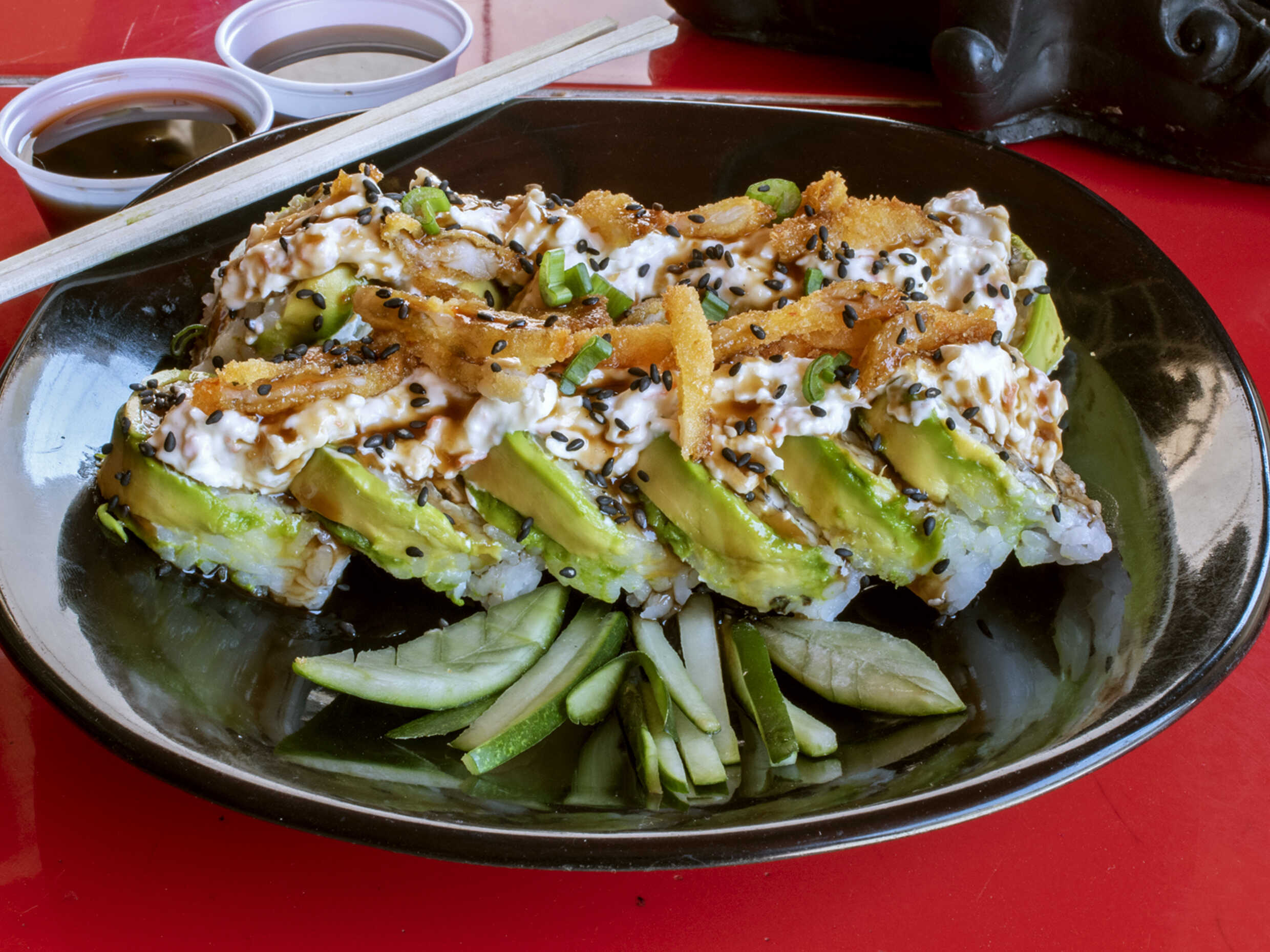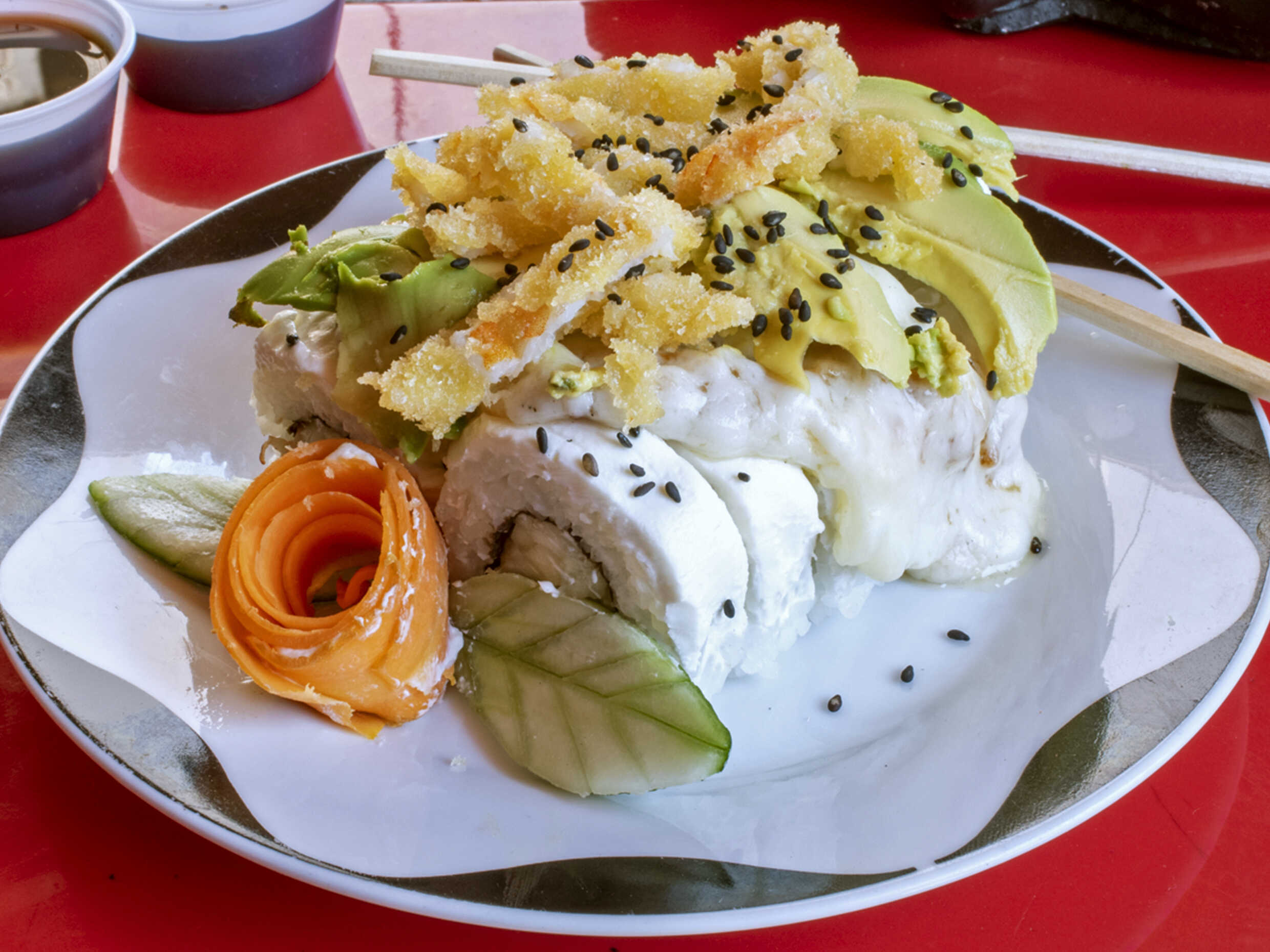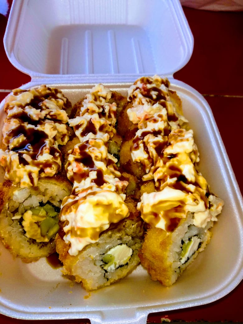 Sushi empanizado relleno de queso manchego, aguacate y res coronado de aderezo spicy.