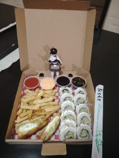 Incluye 1 rollo tradicional a elegir, 1 pza de edge roll, 150 grs (peso en crudo) de papas a la francesa catsup,aderezo spicy, y soyas.