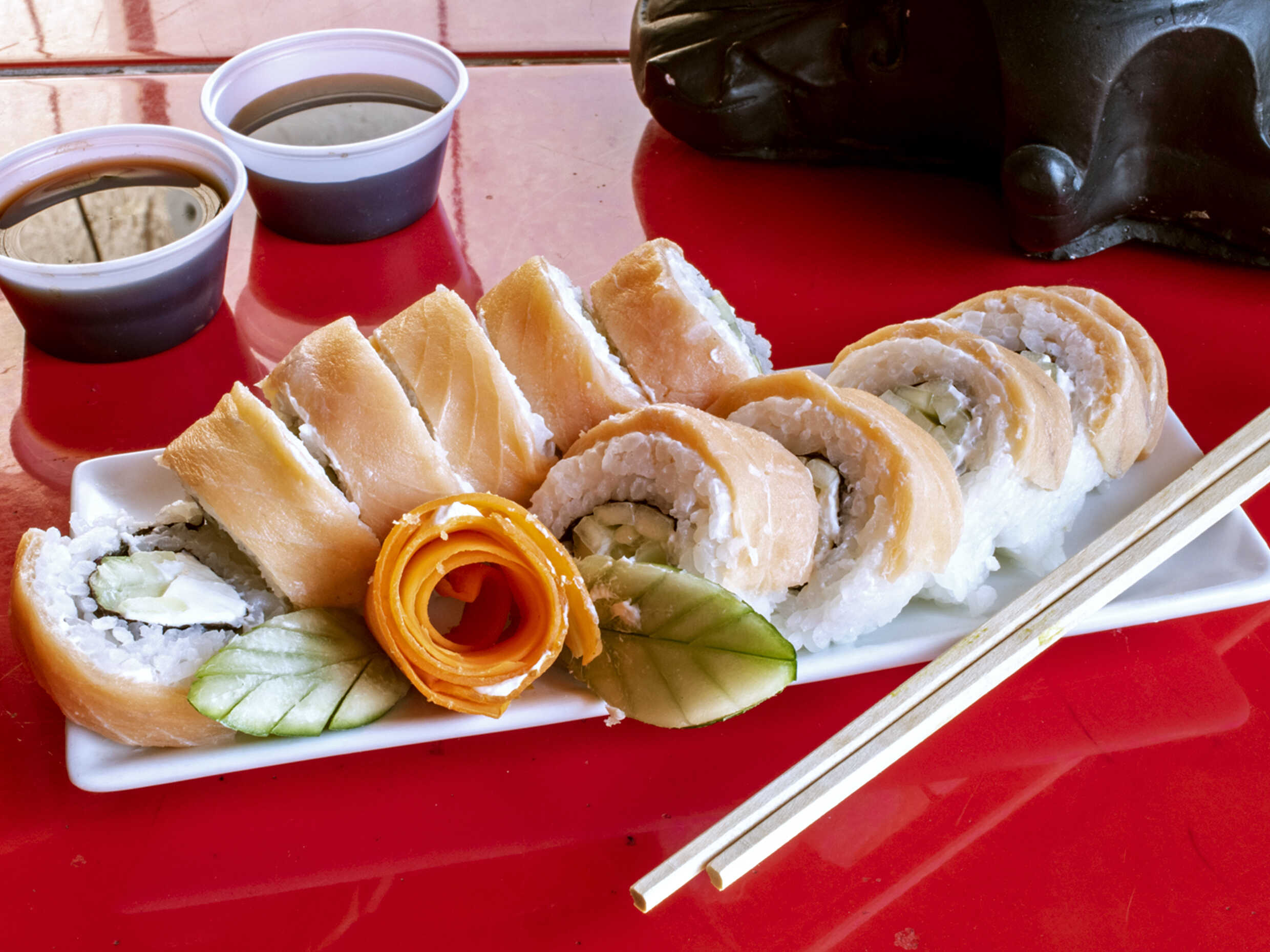 Alga por fuera, rellenos de philadelphia, pepino, y zanahoria.