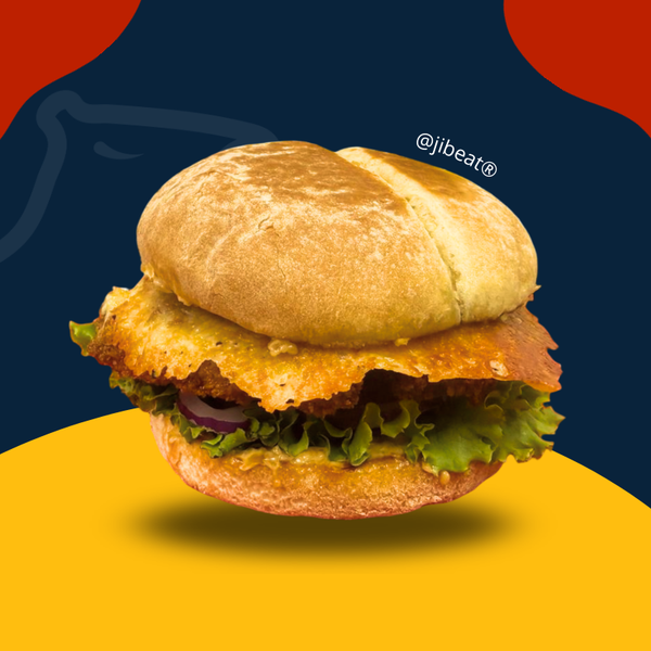 Hamburguesa de pechuga de pollo marinada y empanizada en panko con aderezo de la casa y costra de queso en pan brioche