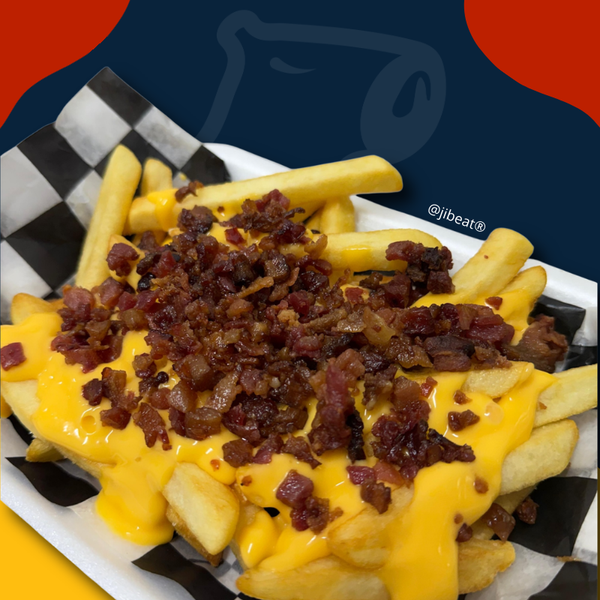 papas a la francesa bañadas en queso amarillo, coronadas con trocitos de tocino ahumado.