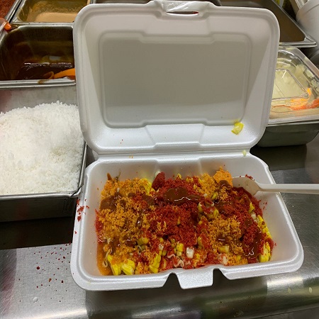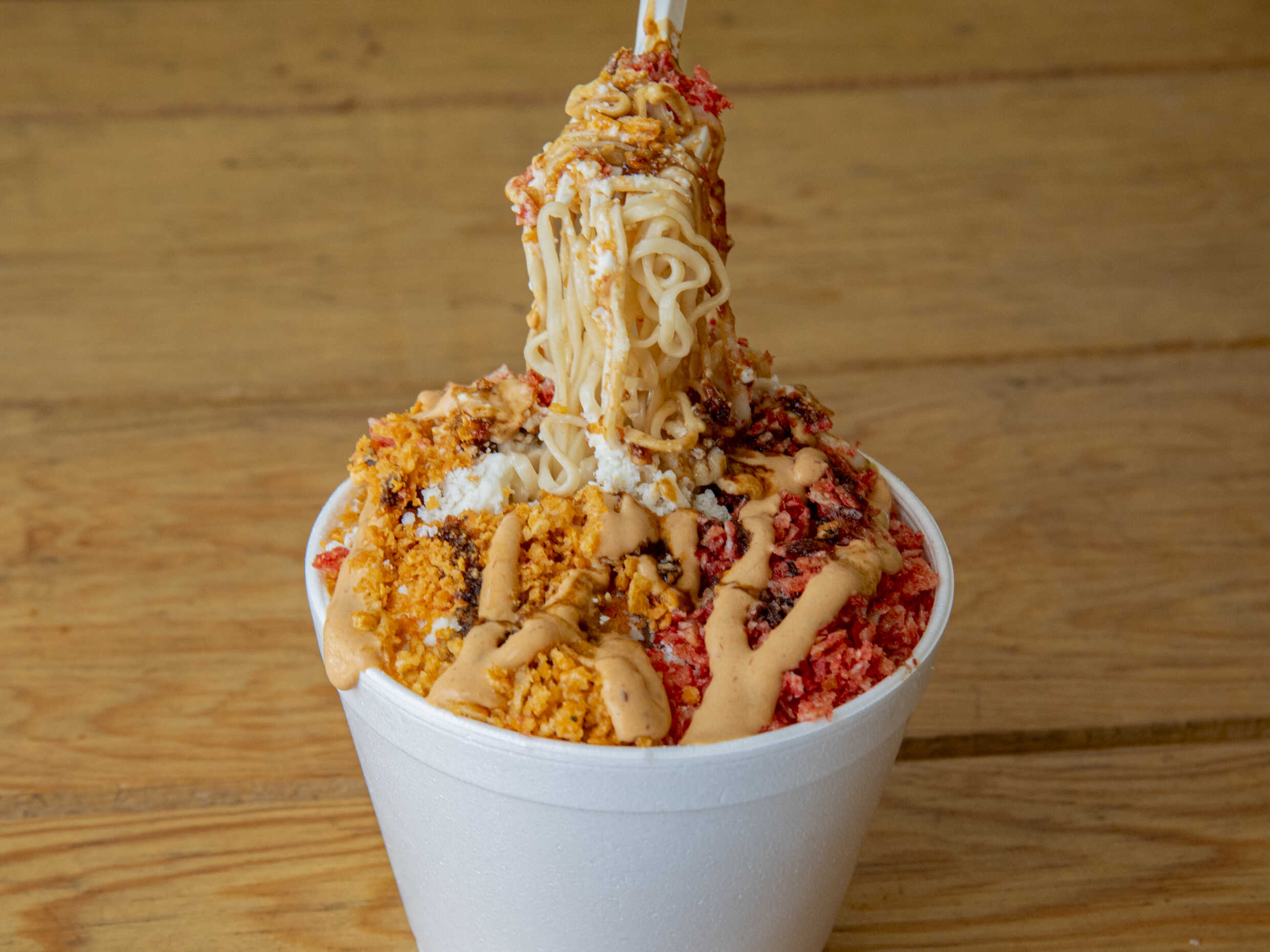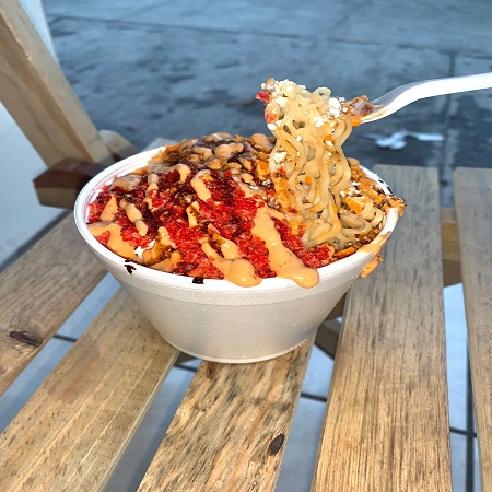 Maruchan con elote rebanado, preparada con crema, queso, chipotle, papitas y salsas negras