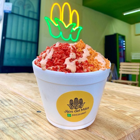 260 g Maruchan con elote rebanado, bañada con salsas negras, limón y las papitas que prefieras