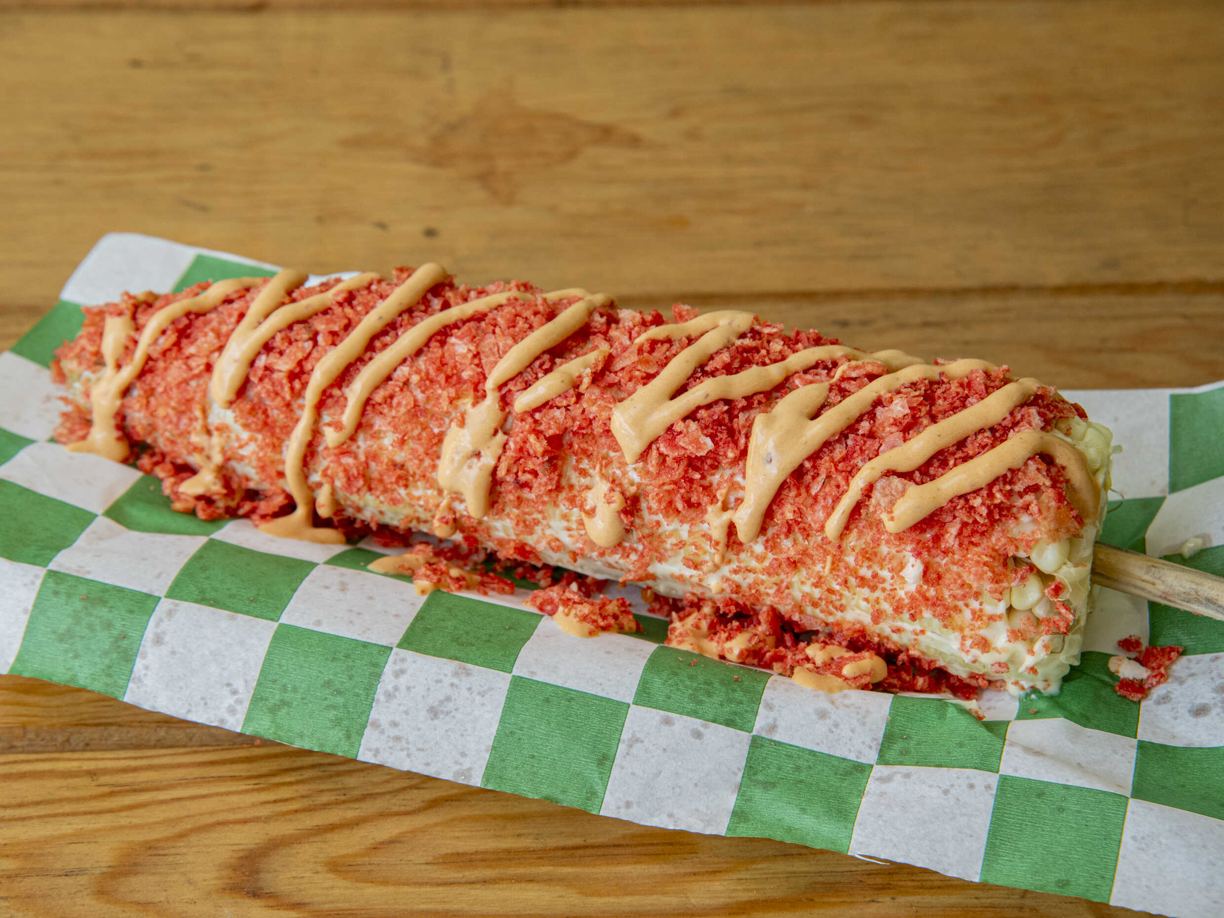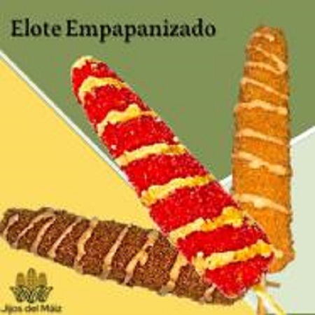 Elote entero bañado con mayonesa, empanizado con tus papitas favoritas y además se acompaña con una crema de chipotle que está para chuparse los dedos