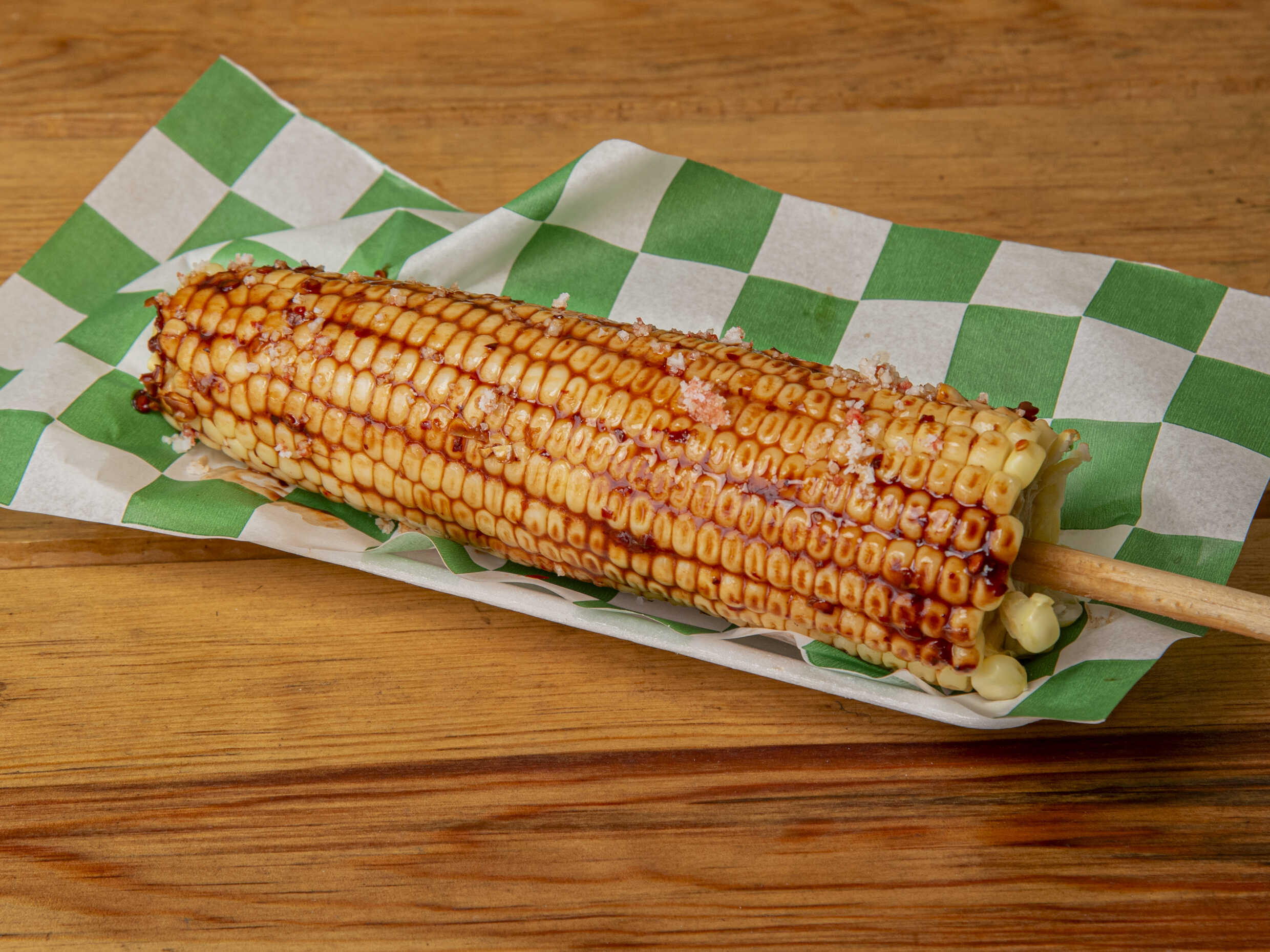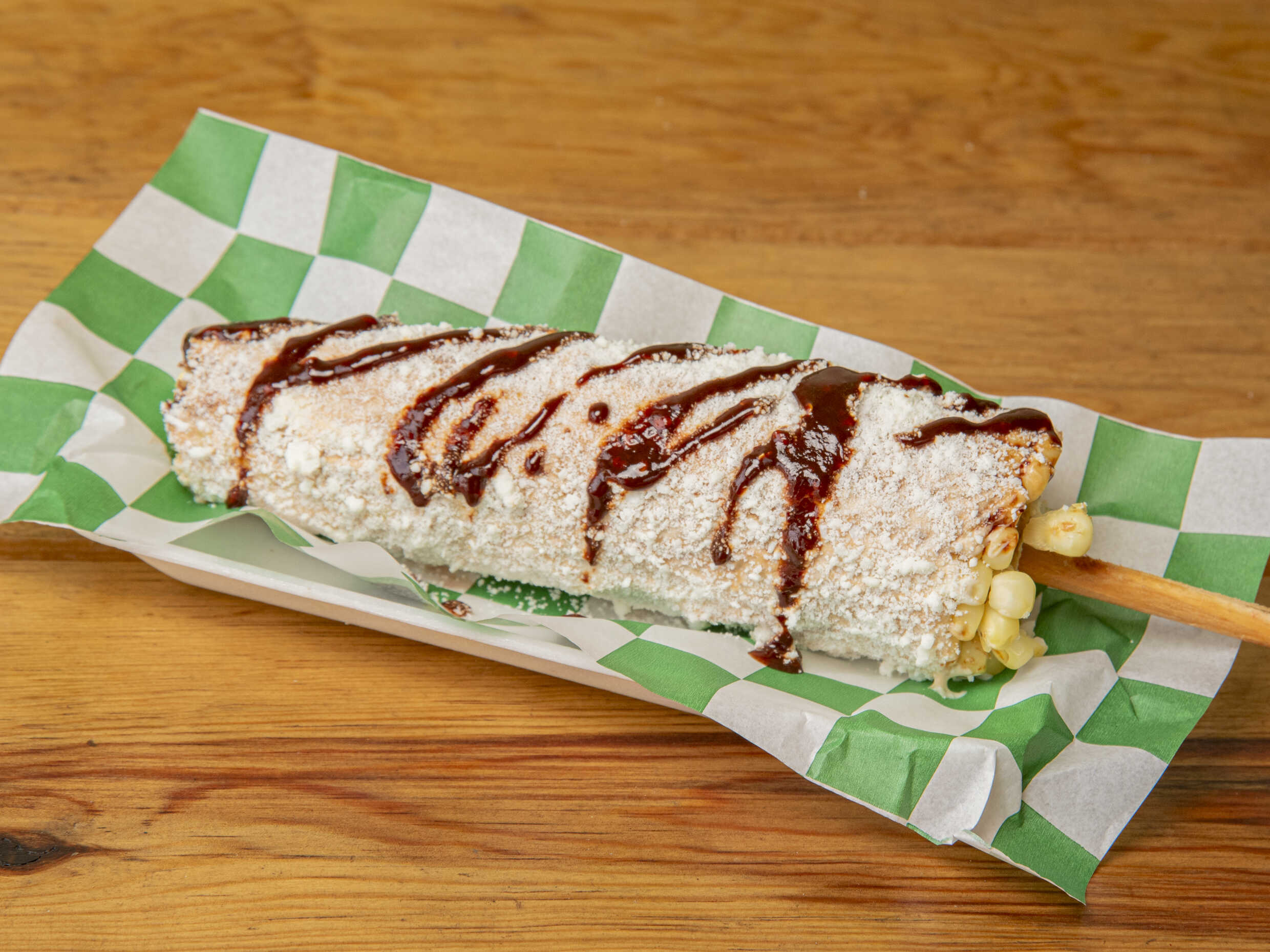 Delicioso elote , acompañado de caldo de elote, queso cotija, crema chipotle y tus papas favoritas.