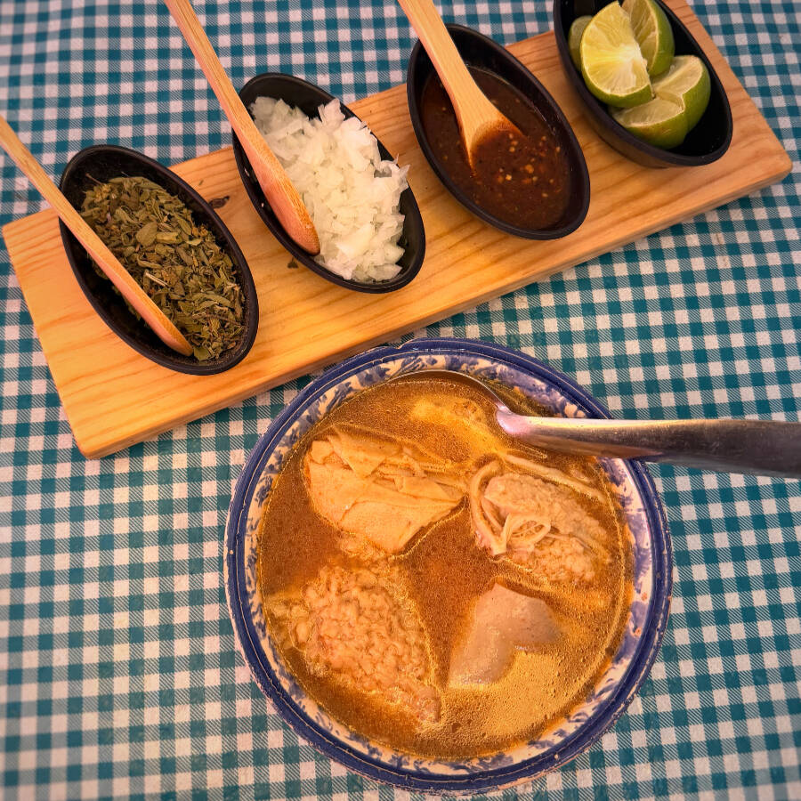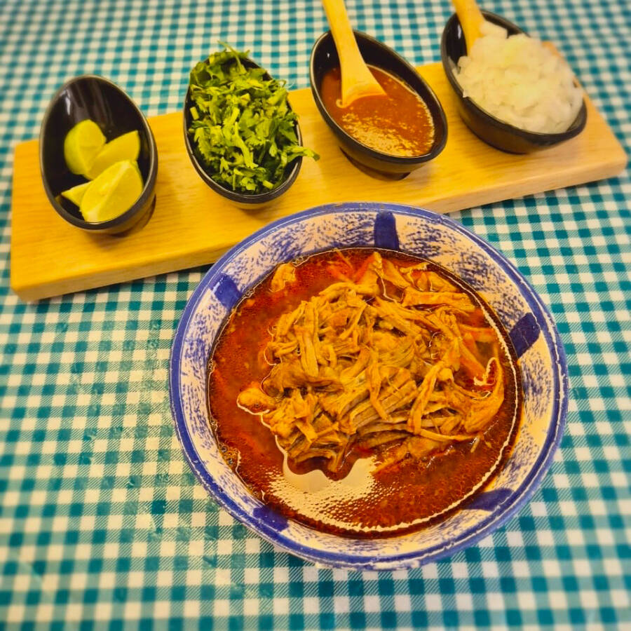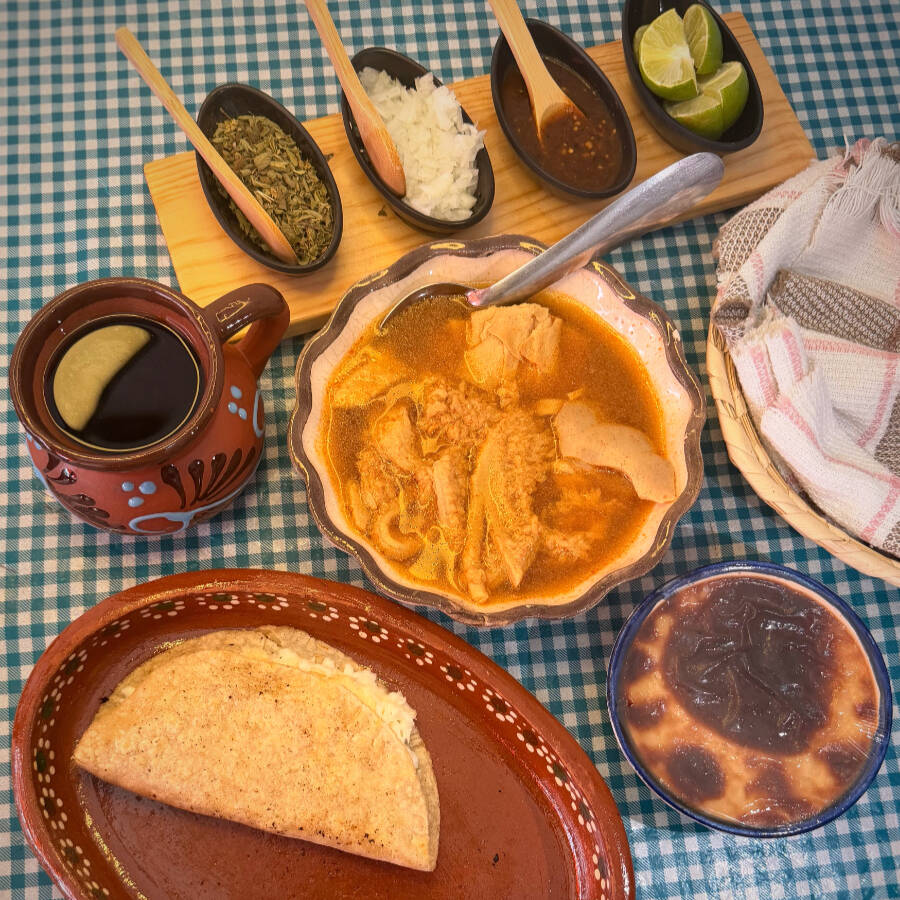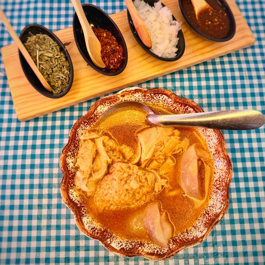 Menudo rojo estilo Jalisco, preparado con caldo de chile rojo bien sazonado y carne de tu preferencia, acompañado de tortillas hechas a mano que realzan su sabor tradicional y auténtico.