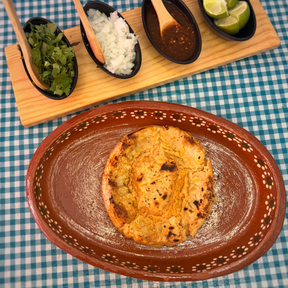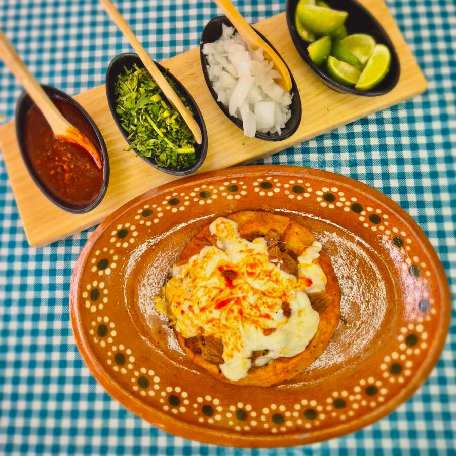 Pellizcada tradicional, hecha con masa suave, untada con mantequilla y queso fundido.
