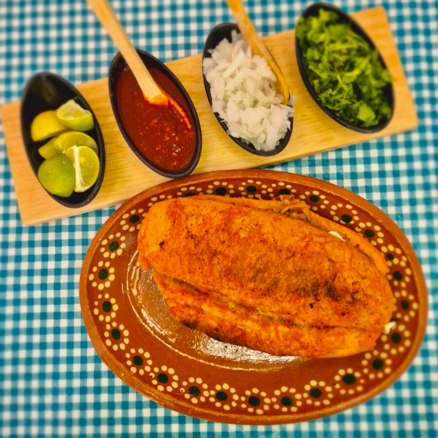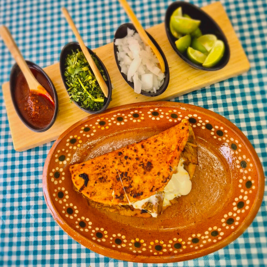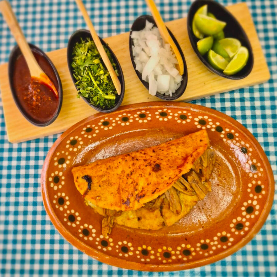 Pellizcada de masa recién hecha, rellena de carne de birria y queso fundido, perfecta para un antojo casero.