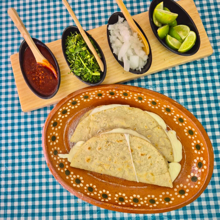 Quesadillas con tortilla recién hecha y queso fundido, suaves y doraditas.