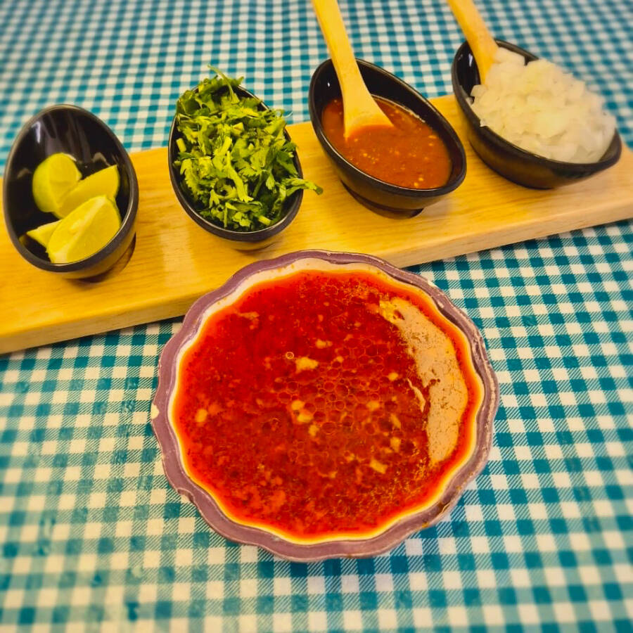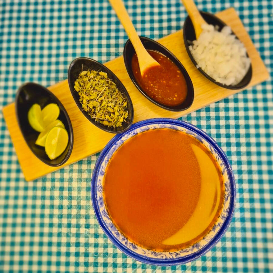 Caldo de menudo rojo, lleno de sabor y especias tradicionales.