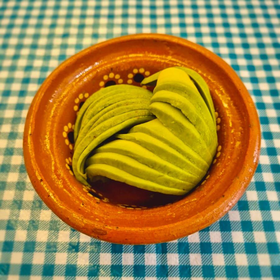 Pellizcada sencilla de masa recién hecha, doradita y untada con mantequilla.