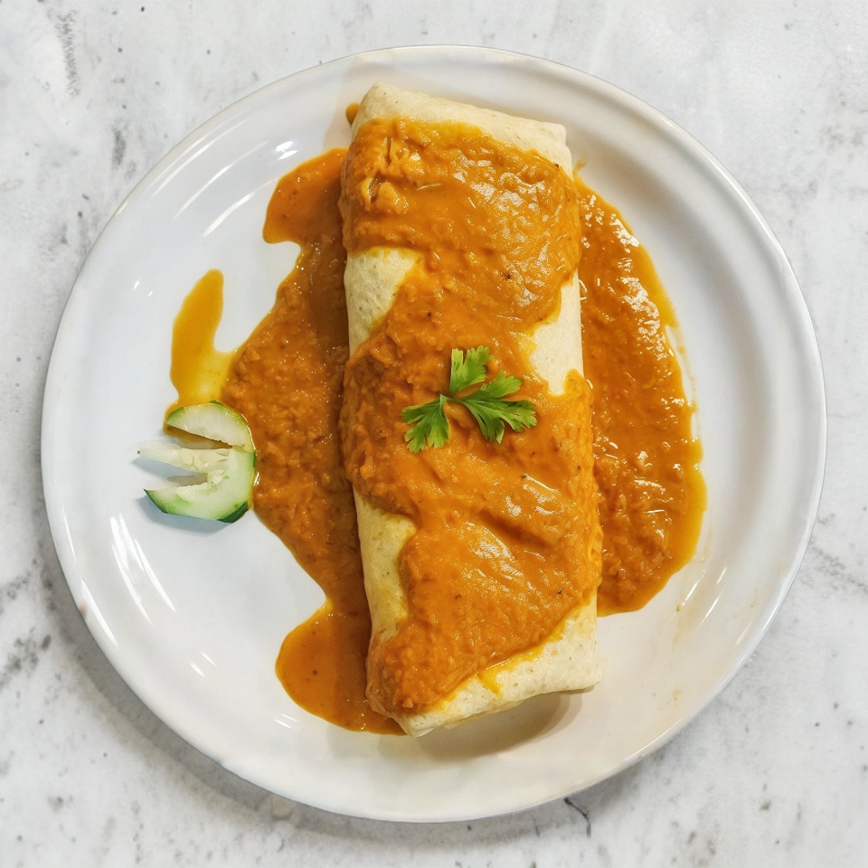 Tortilla de harina rellena de frijoles, arroz, (100gr)pollo a la plancha, y morrones salteados en una salsa de crema acompañado de salsa picante.