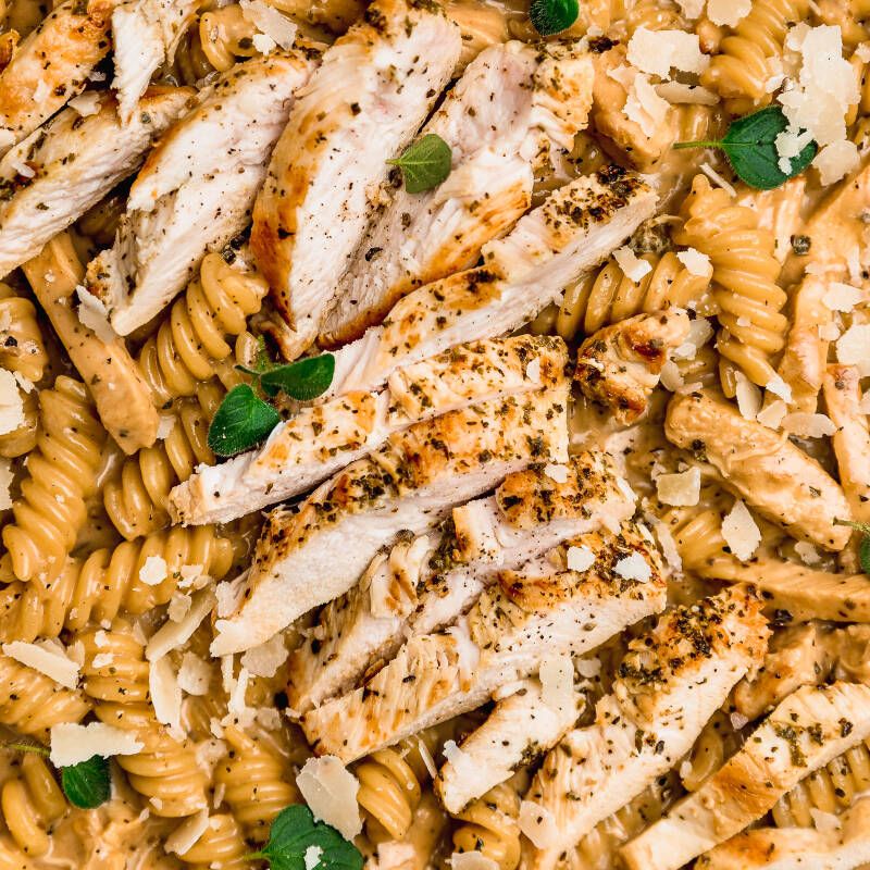 Pasta fusilli, sazonada con salsa chipotle y crema, con 100grms de pollo sazonado