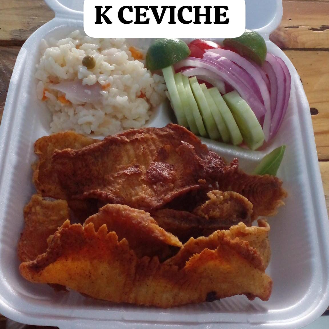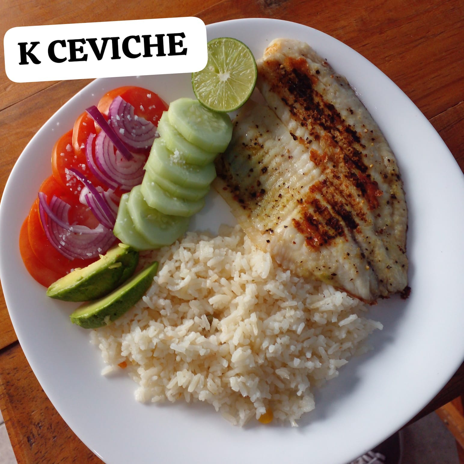Laminas de filete de tilapia doradas acompañado de sopa de arroz y verduras, lleva tortillas aderezo y chile