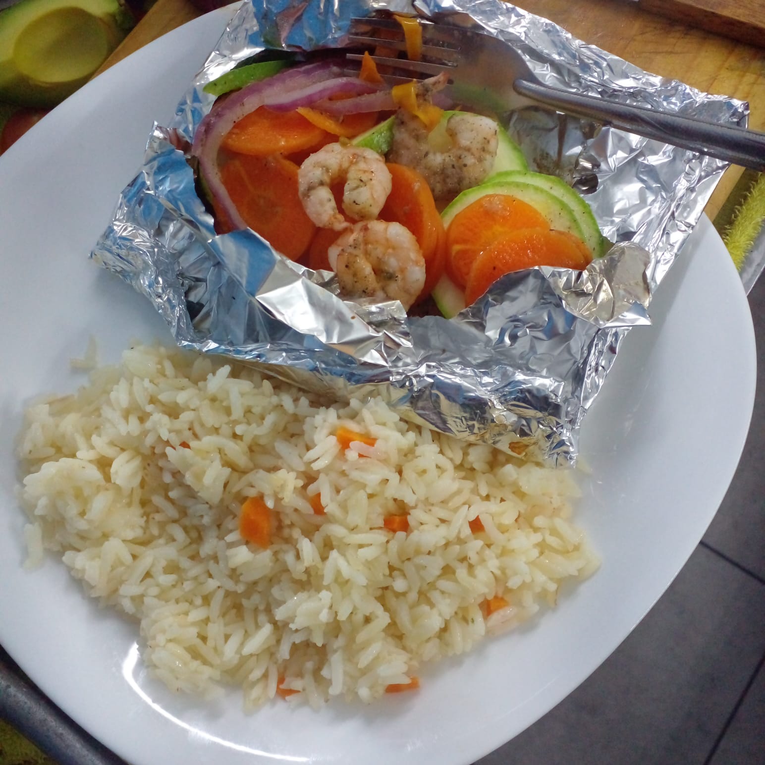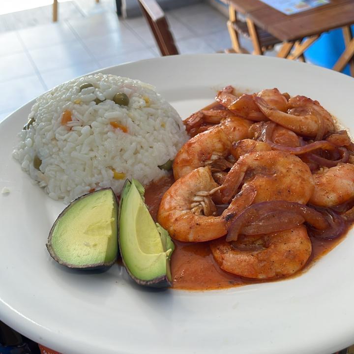 Camarones con varios chiles y catsup ,acompañado de sopa de arroz y verduras, lleva tostadas y galletas saldas