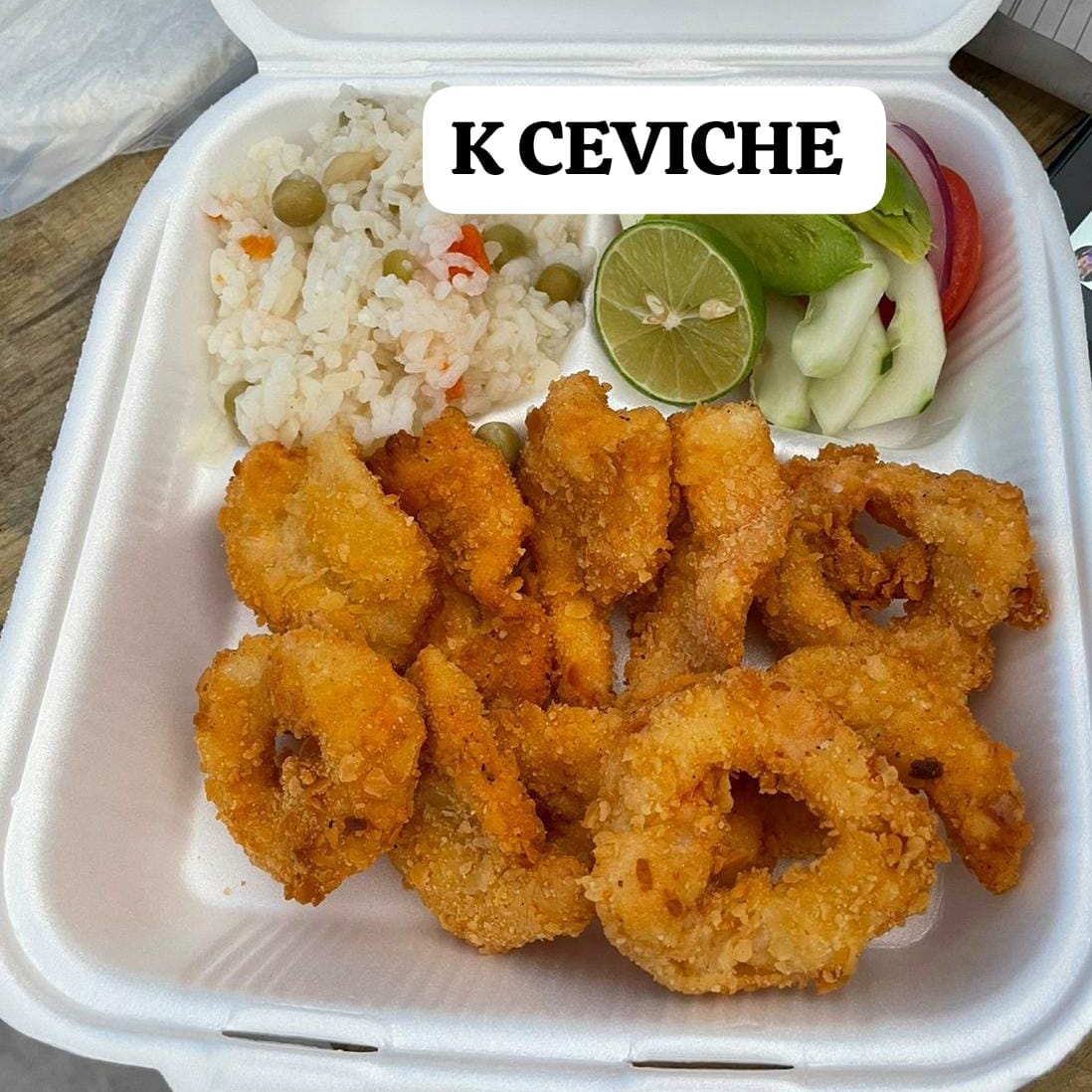 Camarones empanizadosmcon sopa de arroz y verduras, lleva tortillas aderezo y chile