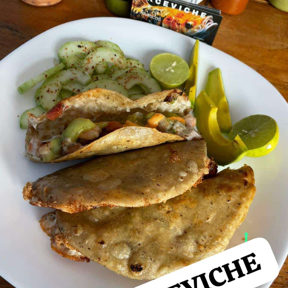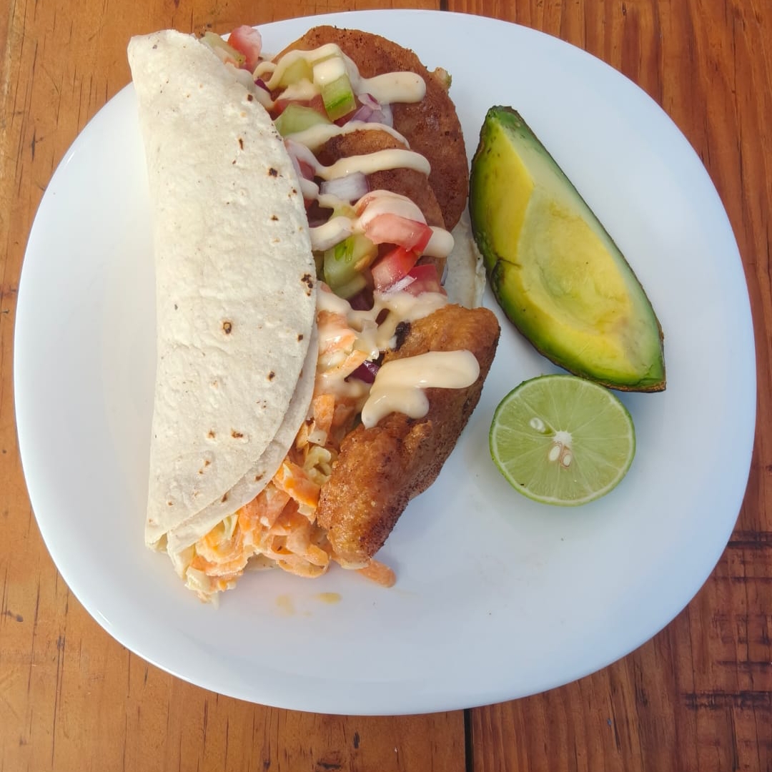 Camarón capeado ,salsa mexicana ,ensalada de col ,limon, aguacate ,aderezo y chile