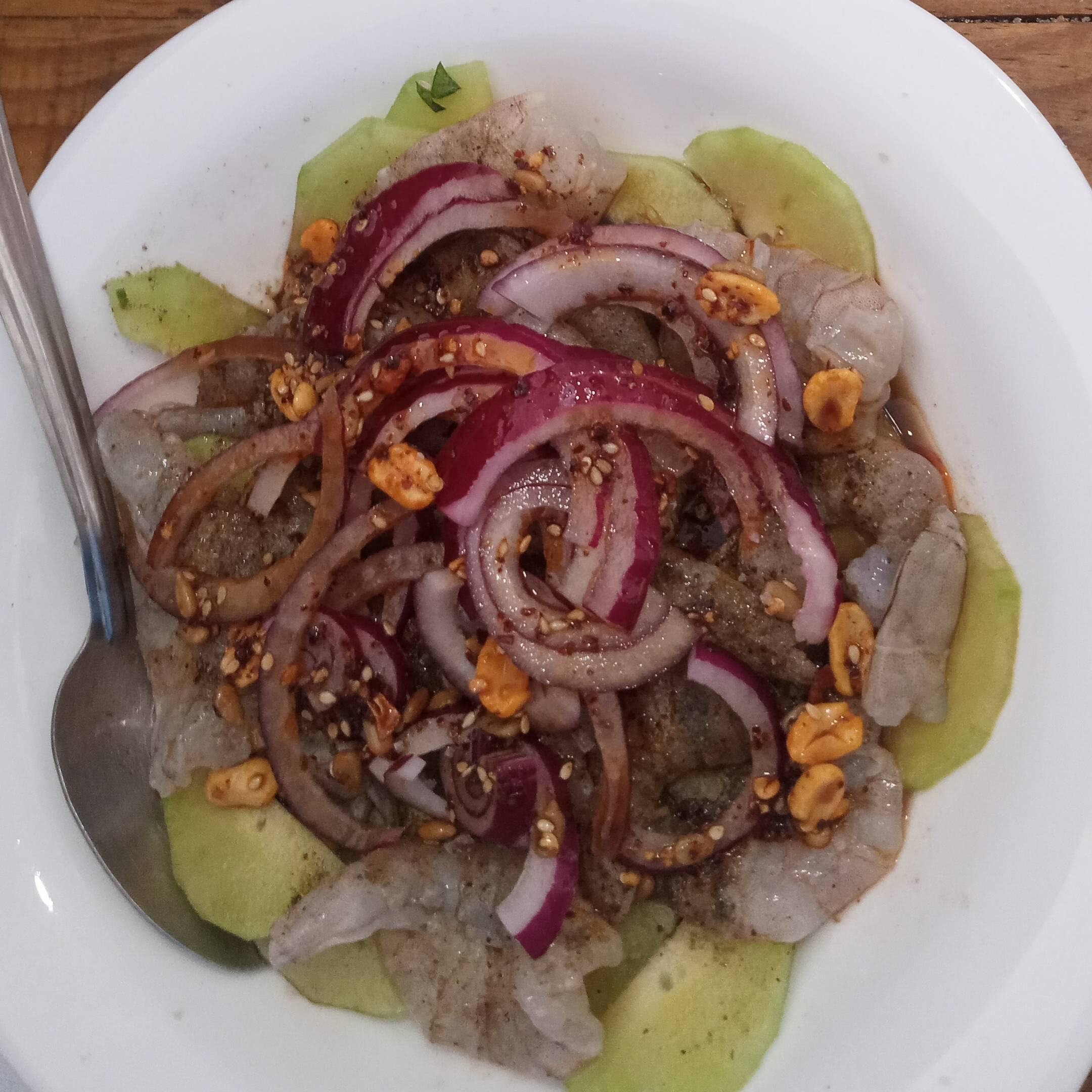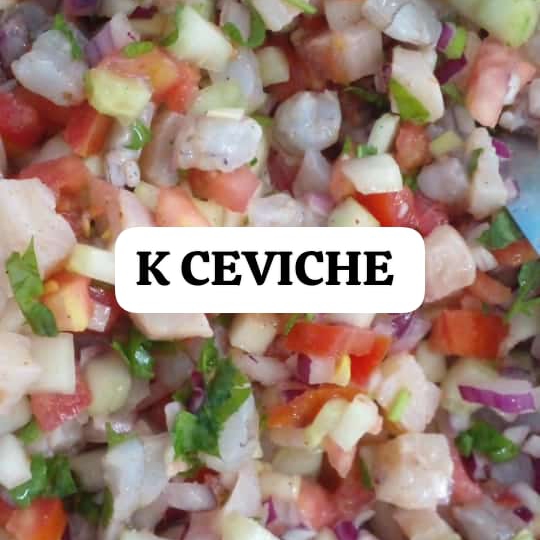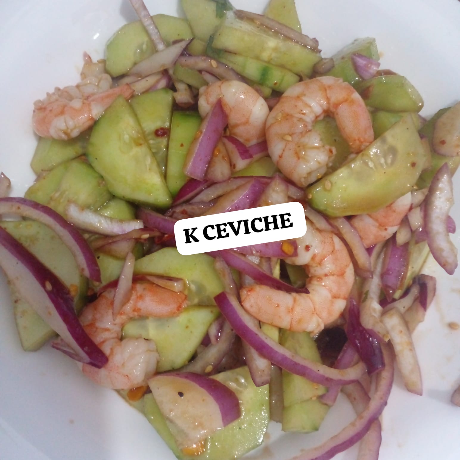 Camarones curtidos en limón con pepino cebolla morada puede ser con chile rojo , verde o negro