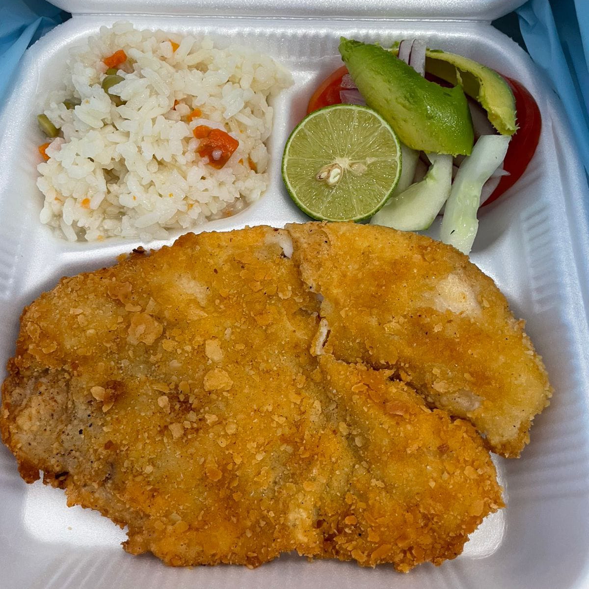 Filete de tilapia empanizado va acompañado de sopa de arroz y verduras, lleva tortillas, aderezo y chile