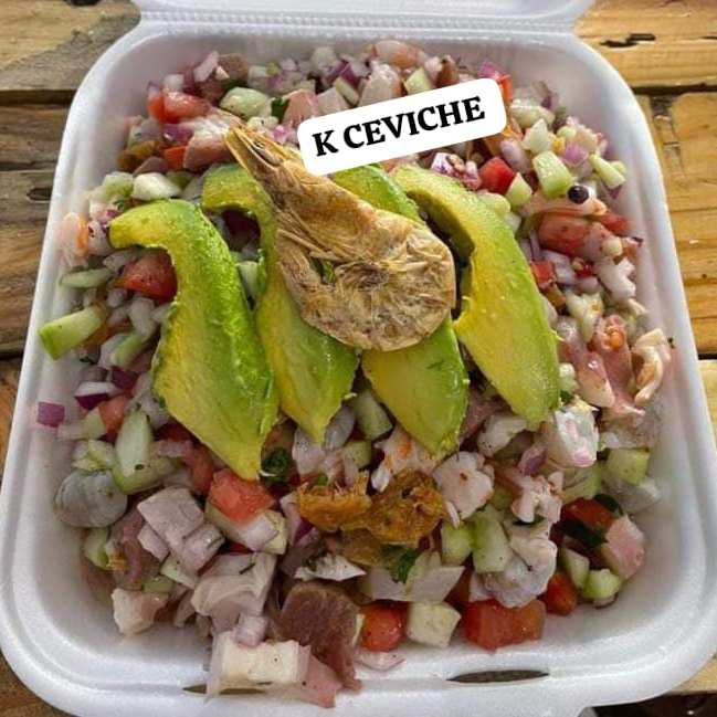 Ceviche con camarón crudo,camarón cocido, camarón seco, pulpo,atún y pescado con salsa mexicana y pepino