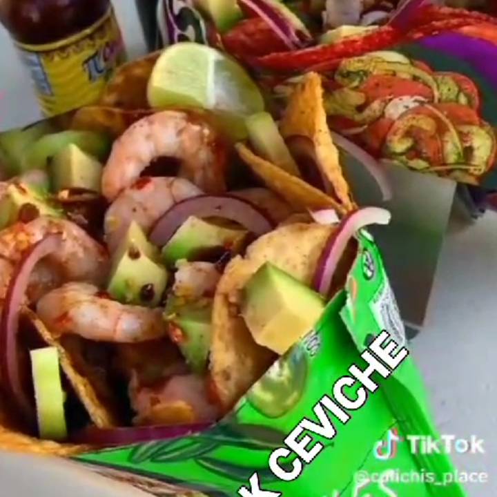 Tostitos con aguachile , puede ser verde, rojo o negro, los tostitos verdes o morados y el camaron cocido o curtidonen limon.